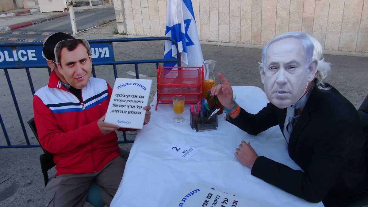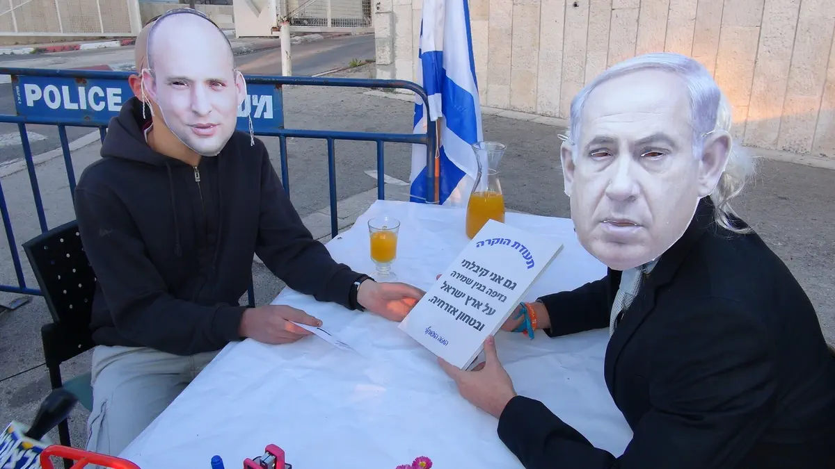 שחקן המחופש לראש הממשלה נזף במיצג בשחקנים המחופשים לשר נפתלי בנט ולסגני השרים מהליכוד, שהתבטאו נגד התוכנית של נתניהו להשארת מתיישבים תחת שלטון פלסטינאי.