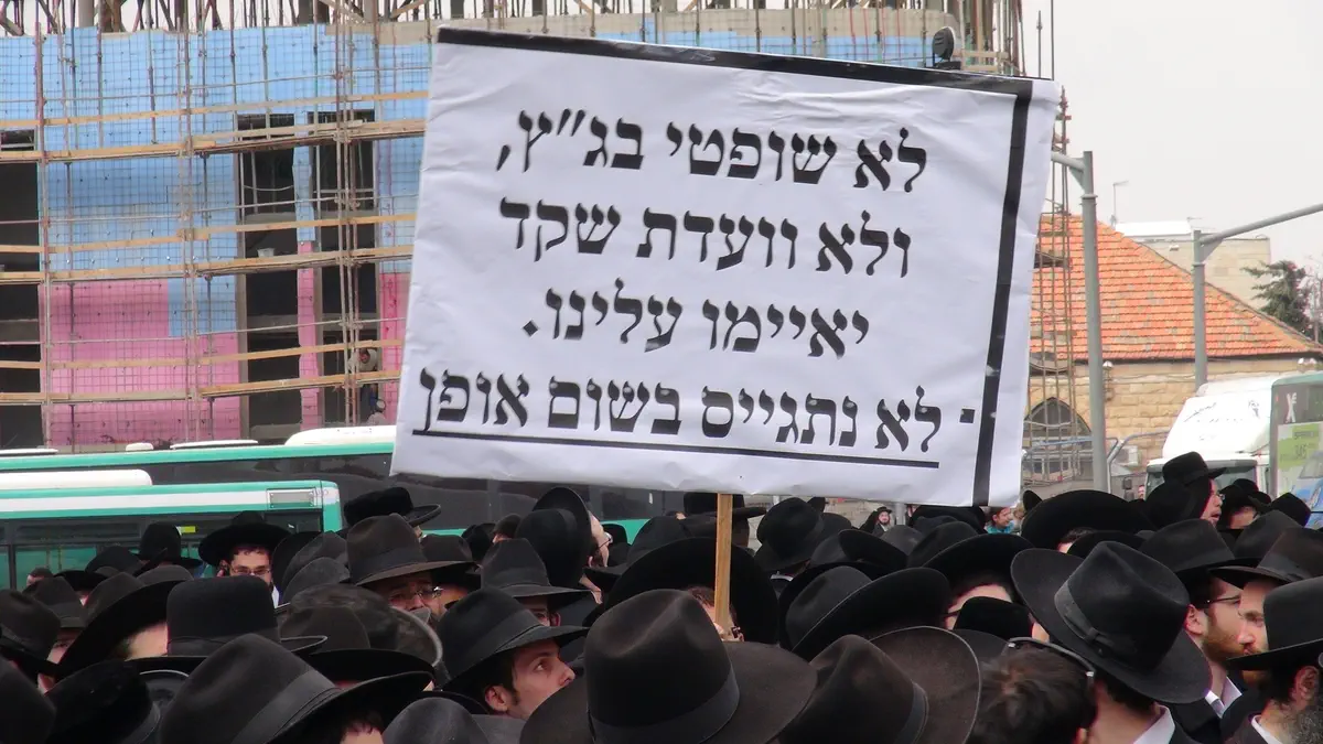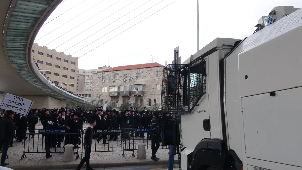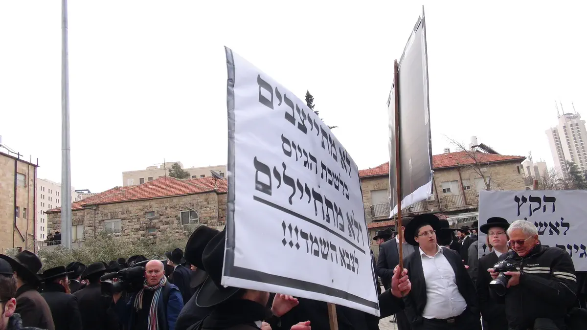 המפגינים מוחים על הקפאת התקציב ומבטאים את החשש מגיוס בכפייה של כלל תלמידי הישיבות בשלב מאוחר יותר.