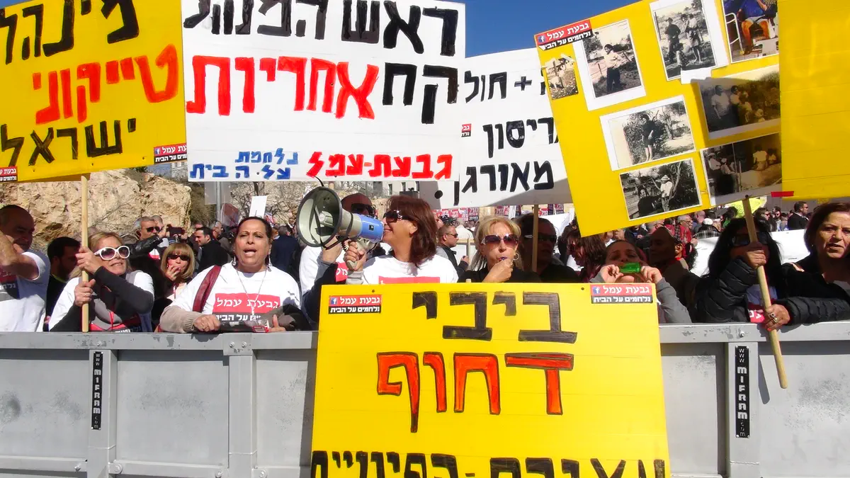 במקביל, מתקיימת במקום הפגנה של עשרות תושבי שכונת גבעת עמל. הם מוחים נגד פינוי משפחות מבתיהם לטובת פרויקט נדל"ן יוקרתי של קבוצתו של יצחק תשובה.