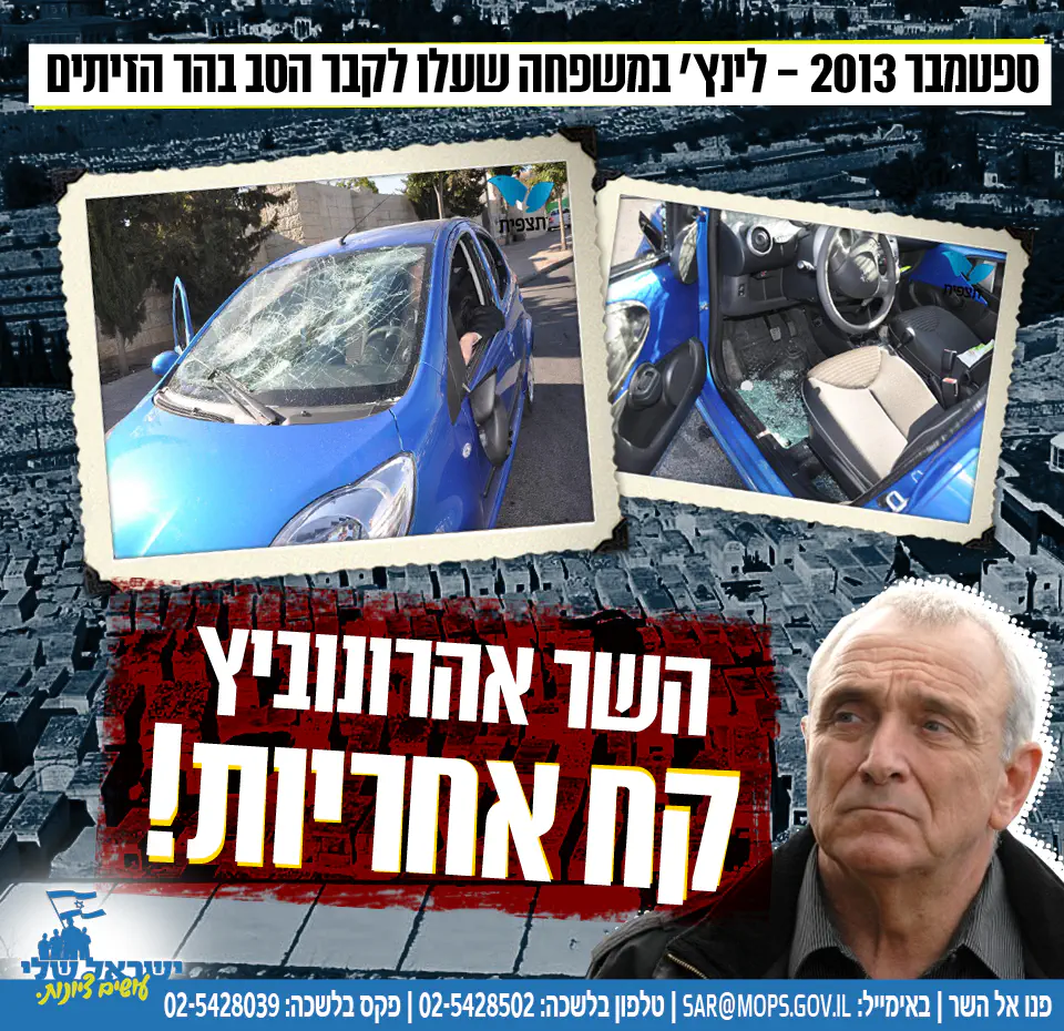 תנועת 'ישראל שלי' יחד עם פעילי התנועה ברשת יוצאים בפעילות על מנת להפסיק את האלימות הערבית בירושלים, וקוראים לשר לביטחון הפנים יצחק אהרונוביץ' לקחת אחריות על האירועים ולטפל בהם ביד קשה.