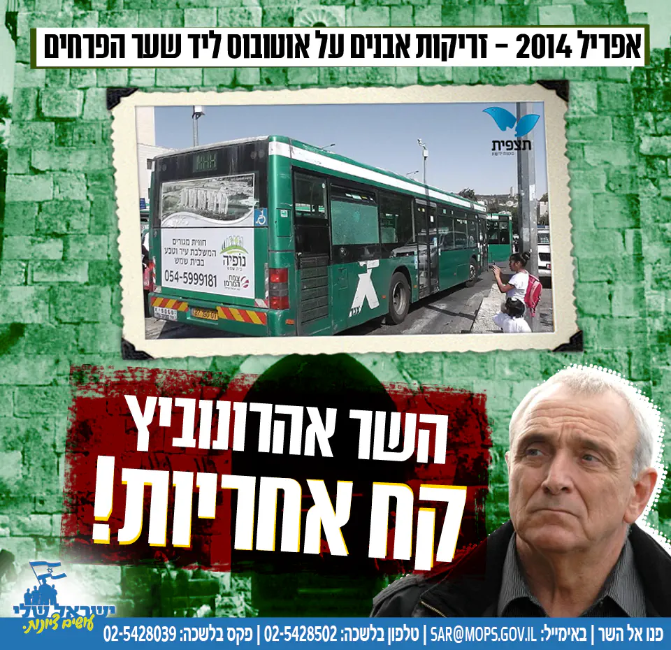 במסגרת הקמפיין עלו לדף הפייסבוק של 'ישראל שלי' תמונות מאירועי הטרור האחרונים נגד ישראלים, בצירוף הקריאה לשר אהרונוביץ' לקחת אחריות. עשרות פעילי התנועה כבר פנו לשר וביקשו ממנו "להפסיק את ההפקרות בירושלים".