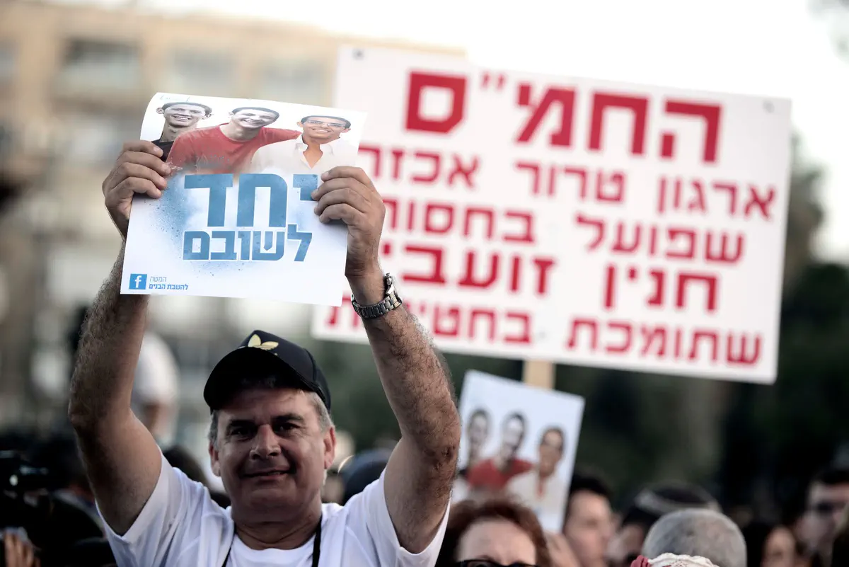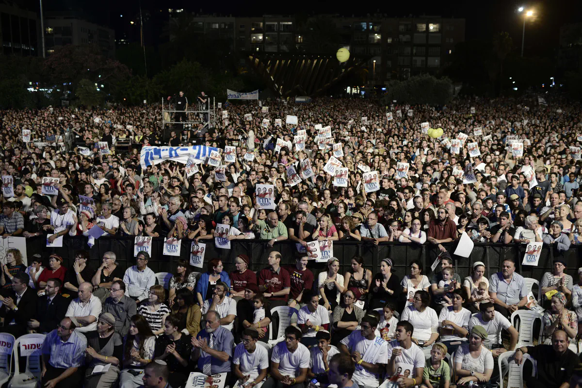 עשרות אלפי בני אדם התקבצו הערב (ראשון) בכיכר רבין בתל אביב, לעצרת בקריאה להצלת שלושת הנערים החטופים, גיל-עד שער, איל יפרח ונפתלי פרנקל, שנחטפו לפני 17 יום בגוש עציון.