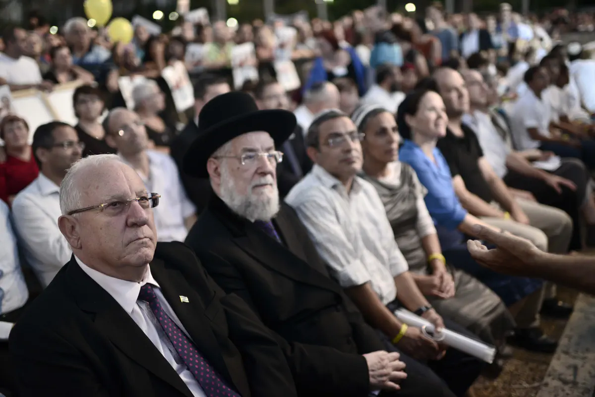 נשיא המדינה הנכנס ריבלין נאם בעצרת ואמר כי "התקבצנו כאן מכל קצוות הארץ, מכל קשת האמונות והדעות, מכל המחנות והשבטים. לא הגענו כדי לעסוק בהערכת מצב ולא התאפסנו אישה ואישה מביתו כדי לערוך תחקירים או כדי לשחזר יחד רגעי ודאות אחרונים. אנחנו כאן הערב כדי לעצור יחד, באנו הנה להתפלל בכל השפות ובשם כל הדתות איננו עוצרים הערב כי איבדנו תקווה אנו עוצרים הערב כי לא איבדנו תקווה כלל".