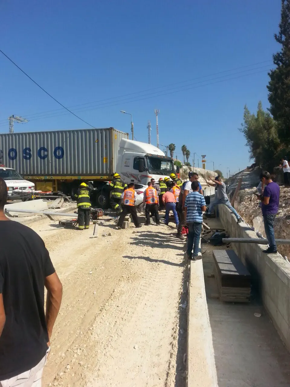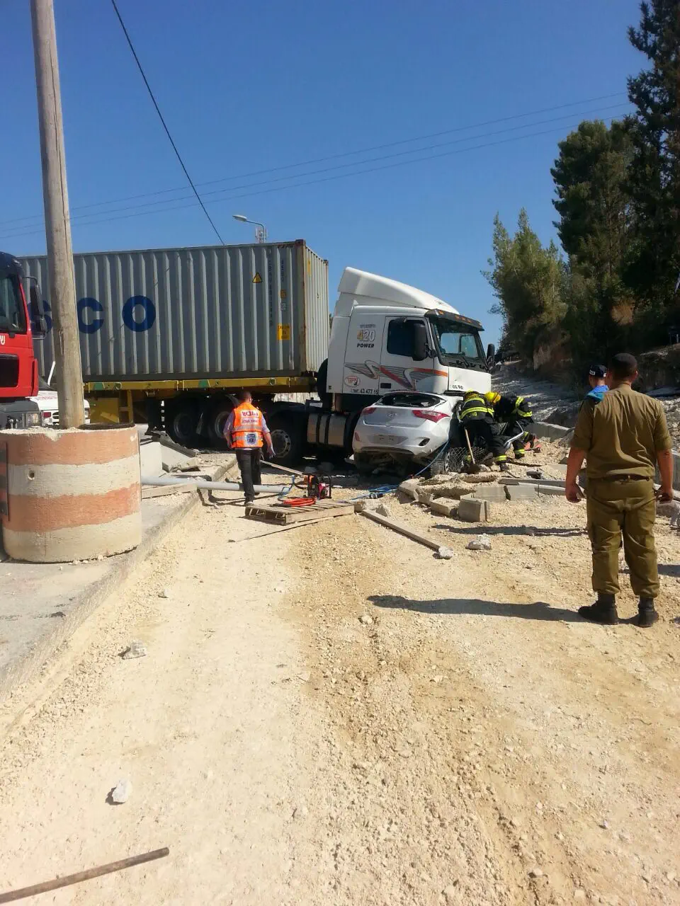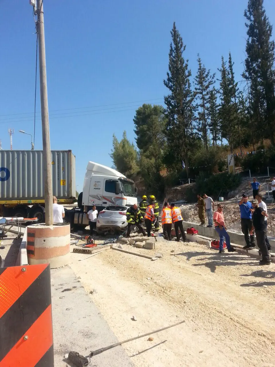 בנצי גולדברג, חובש איחוד הצלה שהגיע לזירה אמר כי "מדובר בתאונה קשה עם מעורבות רכב פרטי ומשאית. אני וחובשים נוספים הענקנו טיפול רפואי ראשוני לנפגע במצב בינוני. צוותי כיבוי פועלים לחילוץ נהג הרכב הפרטי שנהרג במקום, הכביש נחסם לתנועה וכוחות משטרה פועלים בזירה".