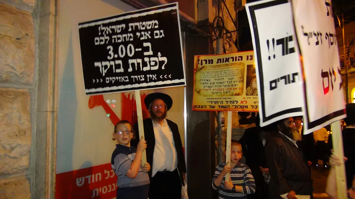 מפגינים חרדים חסמו את רח' יחזקאל פינת שמואל הנביא בירושלים באמצעות פחים בוערים שנגררו לכביש, עם סיום הפגנת החרדים בכיכר השבת.