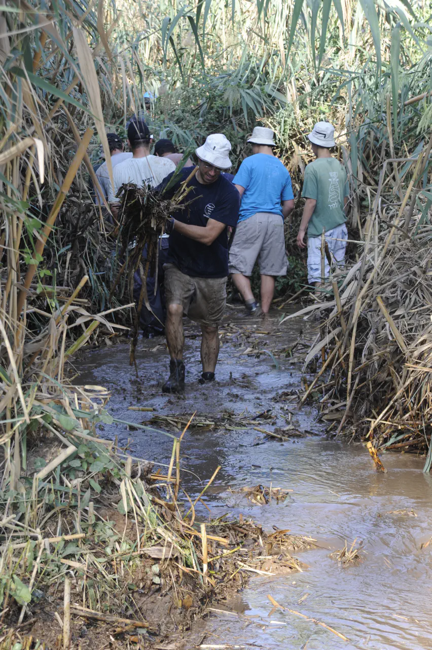 כ-150 בני נוער וחברים מקיבוץ מירב, חיילים מגדס"ר גולני, בני משפחתו של צביקה ז"ל ומתנדבים נוספים, התגייסו לניקוי הנחל ופריצת השביל בתוך סבך צפוף מלא בצמחי קנה ופטל קוצני ובלתי ניתן למעבר.