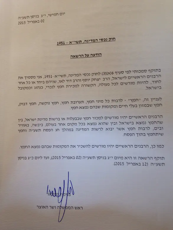 נזכיר, כי הרב הראשי לישראל, הרב דוד לאו, פנה למחרת יום הבחירות למזכיר הממשלה, אביחי מנדלבליט, על מנת שזה יפעל להסדרת נושא מכירת החמץ.