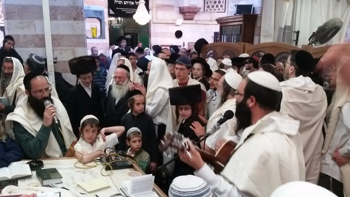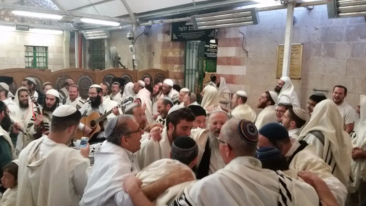 תפילת ותיקין שמחה במיוחד נערכה הבוקר (שני) במערת המכפלה עם רבה של צפת, הרב שמואל אליהו.