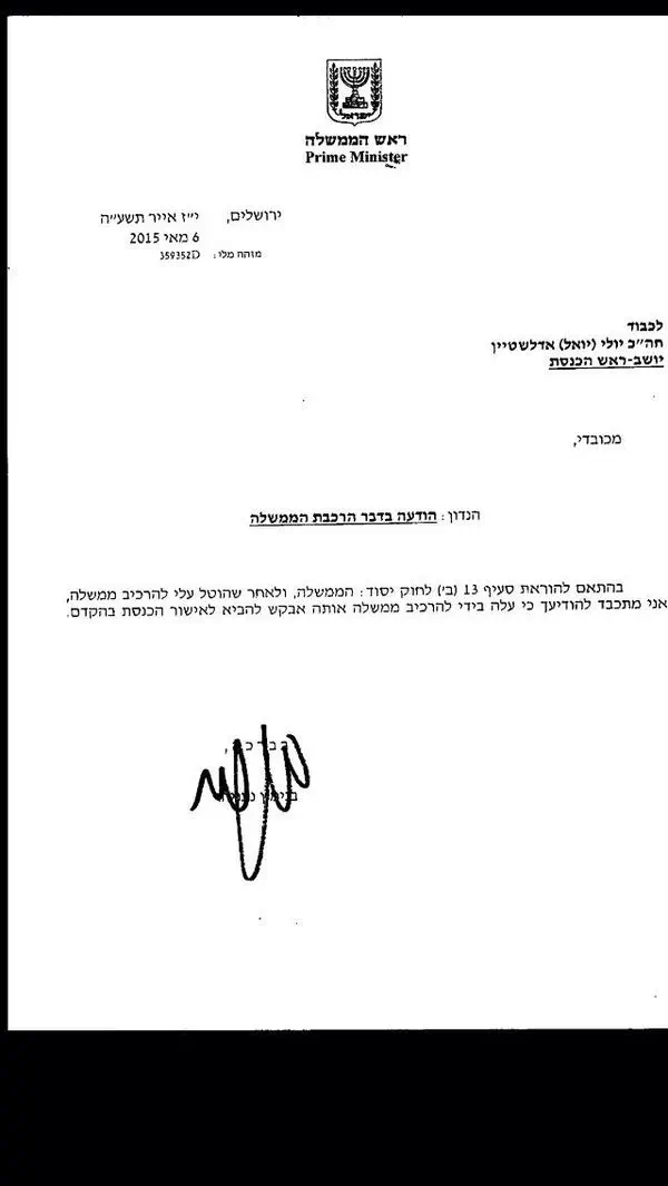 יושב ראש הכנסת יולי אדלשטיין עידכן הלילה כי שוחח עם ראש הממשלה בנימין נתניהו. "קיבלתי ממנו את מכתבו המודיע רשמית, כי עלה בידו להשלים את הרכבת הקואליציה והממשלה. הממשלה הבאה יוצאת, אפוא, לדרך, היא תוצג בשבוע הבא בכנסת ושריה יצהירו אמונים. אמת, הדרך לא הייתה סוגה בשושנים אך הלילה אנו מלאי תקווה להוביל את ישראל קדימה בבטחון, בכלכלה וביתר התחומים. ברכות ודרך צליחה!".
