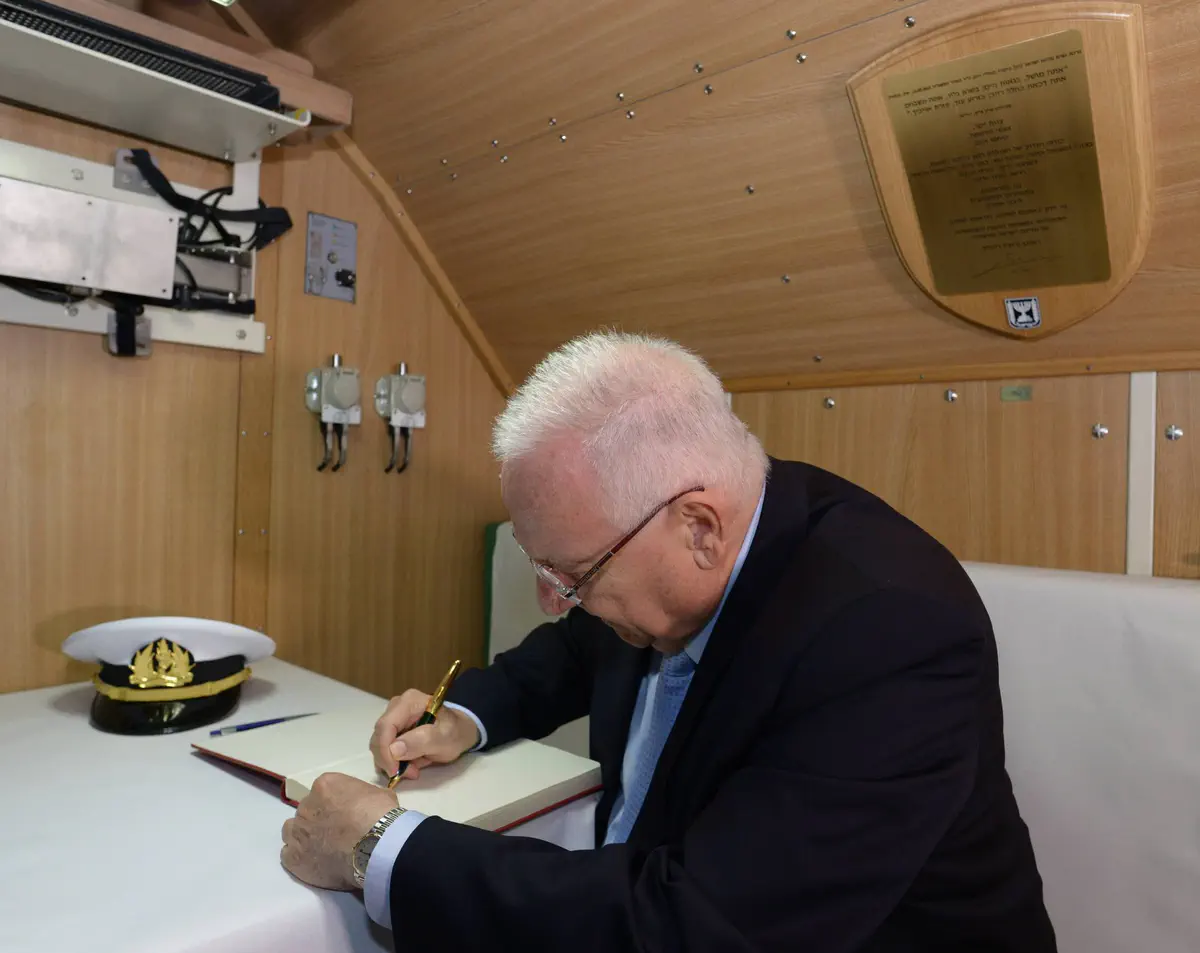 בטרם יצא מן הצוללת היה הנשיא לראשון החותמים בספר האורחים של הספינה וקבע לוחית מזכרת בחדר התדריכים של הספינה עליה נכתב, "כוחה הגדול של הצוללת הוא בליבה הפועם, בצוות המפעיל אותה, הפועל יחד כגוף אחד בכל שעות היממה כשהוא דרוך עירני ונחוש. גם במרחקים, במסתרים ובמעמקים ליבנו איתכם. מי ייתן צאתכם לשלום ובואכם לשלום ושתצליחו במשימת ההגנה המתמשכת על מדינת ישראל ותושביה".