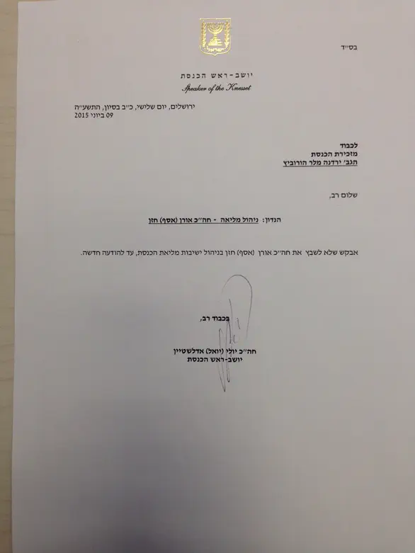 בשיחה הודיע אדלשטיין לחזן כי על רקע הפרסומים הוא לא ישבצו בניהול ישיבות מליאת הכנסת עד הודעה חדשה.