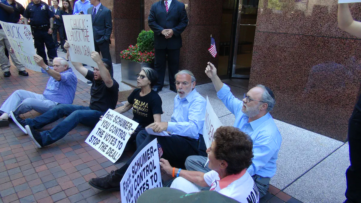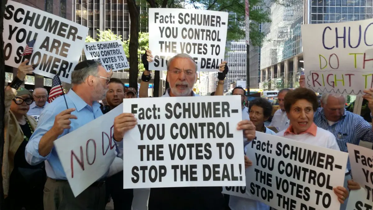 ההפגנה נערכה מול ביתו של הסנאטור האמריקני צ'רלס שומר בדרישה שיתנגד לעסקה שנחתה עם איראן. "אנו מבקשים משומר שיעמוד וינהיג את המאבק הזה. הקול של שומר קריטי, וסנאטורים רבים מסתכלים עליו לראות מה עמדתו. אני רואה מיליונים באיראן צועקים "מוות לאמריקה, מוות לישראל", ואנו מנהלים משא ומתן עם המשטר הזה? זה טירוף", אמר הייקנד.