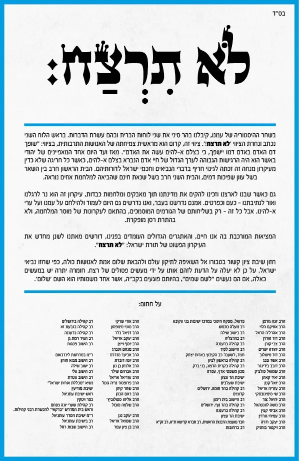 תחת הכותרת "לא תרצח" כותבים הרבנים כי "בשחר ההיסטוריה של עמנו קיבלנו בהר סיני את שני לוחות הברית ובהם עשרת הדברות. בראש הלוח השני נכתב ונחרת הציווי: 'לא תרצח'. ציווי זה קדום הוא מראשית צמיחתה של האנושות התרבותית, בציווי: 'שופך דם האדם באדם דמו יישפך, כי בצלם אלוקים עשה את האדם'.
