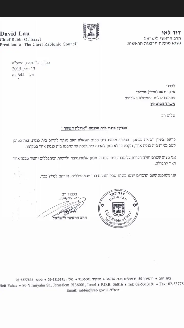 "אני מציע שטרם יעלה הכורת על מבנה בית הכנסת תנתן אלטרנטיבה ולרשות המתפללים יעמוד מבנה אחר ראוי לתפילה", קבע הרב לאו.