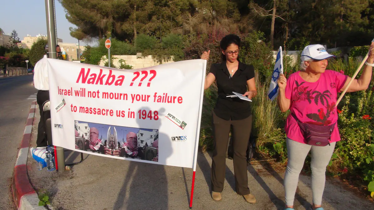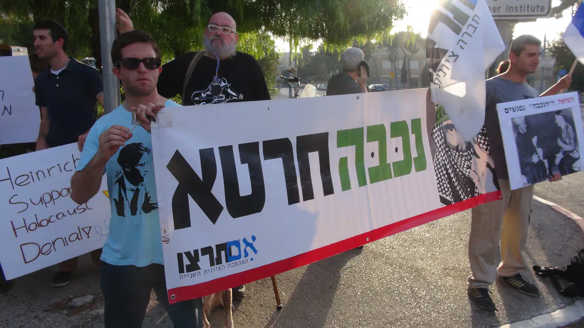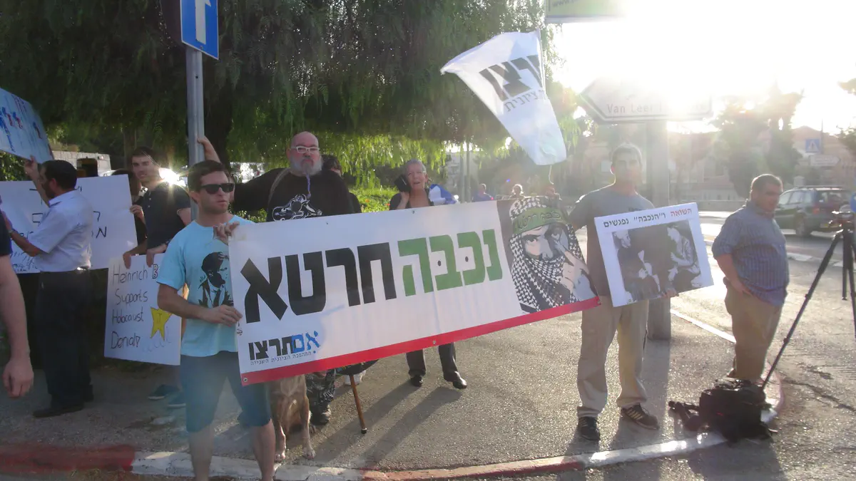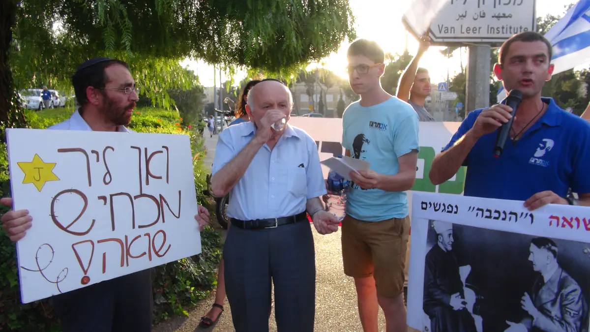 פעילי תנועת "אם תרצו" הפגינו הערב (שני) מול מכון ון ליר בירושלים בו התקיימה השקת הספר "השואה והנכבה: זיכרון, זהות לאומית ושותפות יהודית–ערבית", המשווה בין שואת היהודים ל"נכבה" הפלסטינית.