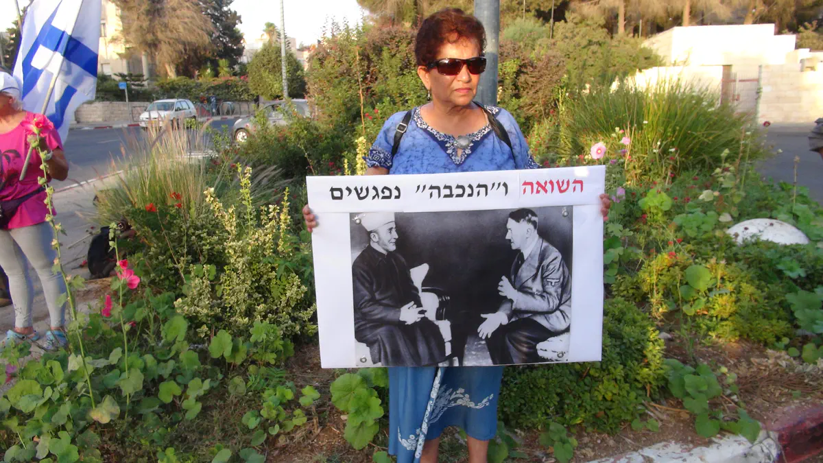 הנוכחים החזיקו בשלטים עליהם מתנוססים תמונת הפגישה בין היטלר למופתי של ירושלים, חאג' אמין אל חוסייני ששיתף פעולה עם היטלר, ושלטים עם הכיתוב "נכבה?חרטא!".