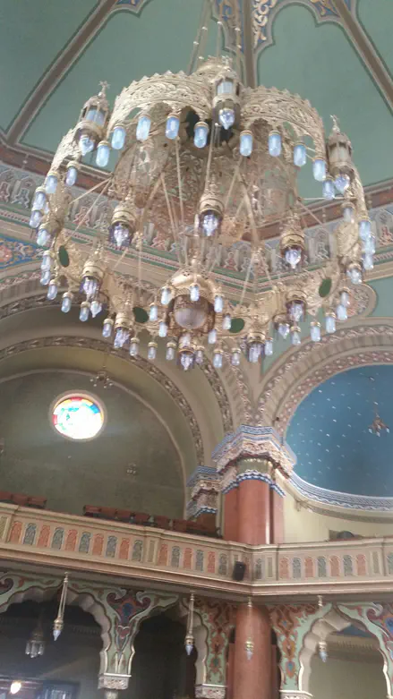 גג המבנה, שגובהו כ-33 מטר, מורכב מ-6 קמרונות, הגדול שבהם מתומן בקוטר 20 מטר, וכן מ-6 מגדלים. הקמרונות והמגדלים מעוטרים ב-12 מגיני דוד. העמודים עשויים שיש איטלקי, והחלל הפנימי מעוטר בגילופי עץ ובמוזאיקה בסגנון ונציאני בחלונות.