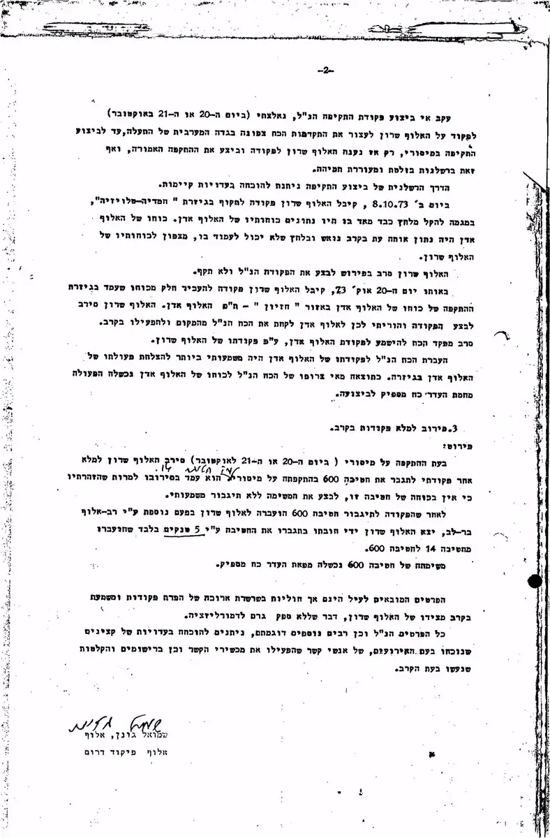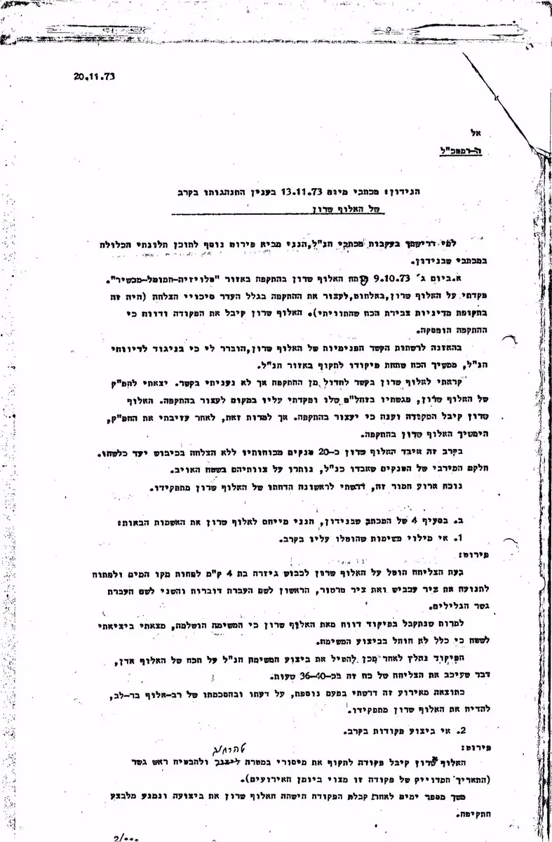 גונן פירט במכתב נוסף ששלח לרב אלוף אלעזר את פרטי המקרה ואת העבירות בהן הוא מאשים את שרון. הוא טען כי שרון ביצע תקיפה בניגוד להוראתו, וגם לאחר שהתחייב להפסיק את התקיפה המשיך בה. במקרה אחר טען גורדיש כי שרון סרב לבצע פקודה שהוטלה עליו.