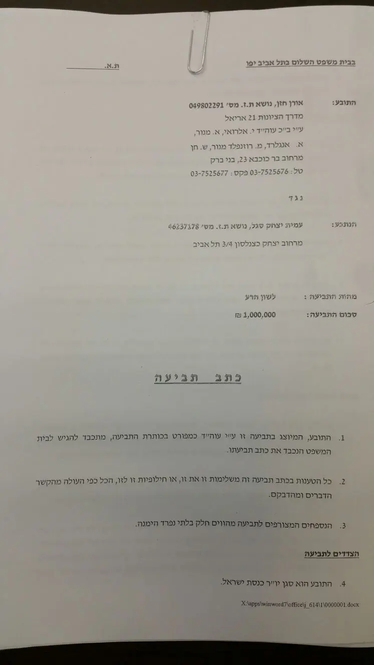 נציין כי התביעה הוגשה באופן אישי נגד סגל, וזאת בניגוד לנוהג לפיו התביעה מוגשת במקביל נגד העיתונאי ונגד כלי התקשורת הרלוונטי.