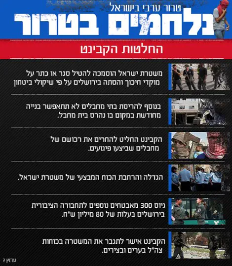 בתום ישיבה ארוכה של הקבינט המדיני-ביטחוני אישרו הלילה (רביעי) השרים שורת צעדים נוספים להתמודדות עם גל הטרור הערבי ברחבי הארץ.
