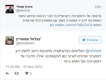 ח"כ אילן גילאון ממרצ קרא לעבר יו"ר להב"ה - "אתה המיץ של הזבל. אתה העורלה של ה-KKK היהודי, אתה התשפוכת שלו. אין לי עניין להיות חלק מהמיצג הבזוי הזה. אתם הסיוט הציוני. אתם האג'נדה של המוות".