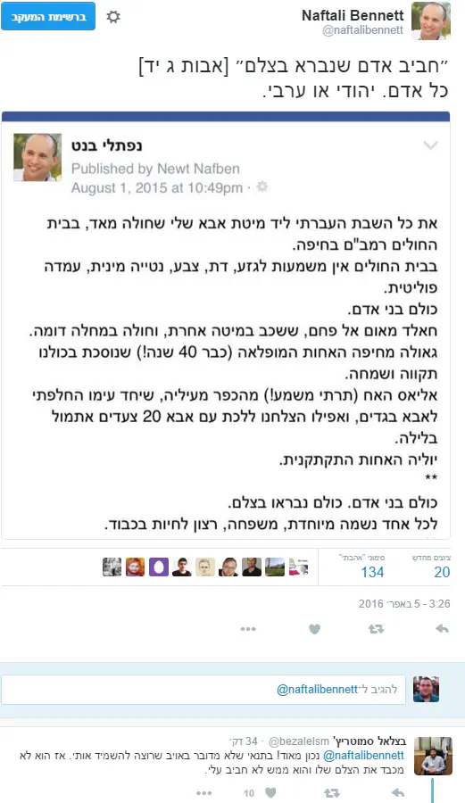 אפילו שר החינוך, יו"ר הבית היהודי נפתלי בנט, הגיב לסערה וכתב בחשבון הטוויטר שלו "'חביב אדם שנברא בצלם'. כל אדם. יהודי או ערבי''. סמוטריץ' השיב לו ''נכון מאוד! בתנאי שלא מדובר באויב שרוצה להשמיד אותי. אז הוא לא מכבד את הצלם שלו והוא ממש לא חביב עלי''.