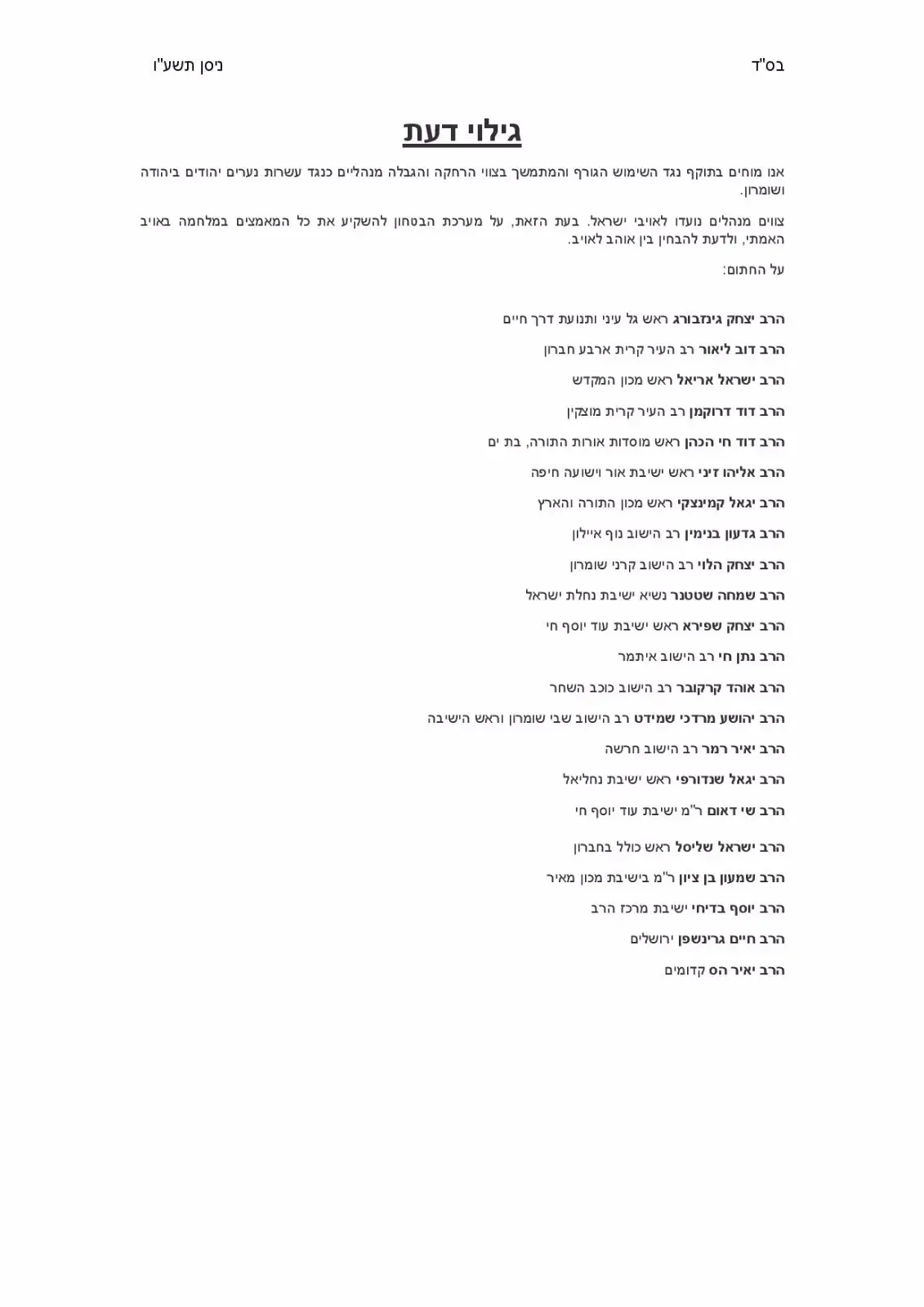 בין הרבנים אשר חתומים על גילוי הדעת ניתן למצוא את הרבנים הרב יצחק גינזבורג - ראש גל עיני ותנועת דרך חיים, הרב דוב ליאור - רב העיר קרית ארבע חברון, הרב ישראל אריאל - ראש מכון המקדש, הרב דוד דרוקמן - רב העיר קרית מוצקין, הרב דוד חי הכהן - ראש מוסדות אורות התורה בת ים והרב אליהו זיני - ראש ישיבת אור וישועה חיפה.