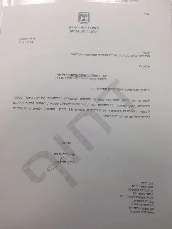 במכתב ששיגר אמש עו"ד פת לרב רבינוביץ' הוא הדגיש, "לאחר בדיקת הנושא, לאחר התייעצות עם הגורמים המשפטיים הרלוונטיים, ועל דעת היועץ המשפטי לממשלה הגענו למסקנה כי בנסיבות העניין אין מקום להפעלת סמכותך בהתאם לתקנה 2(א)(א1) לתקנות השמירה על מקומות קדושים ליהודים, תשמ"א-1981 (להלן - התקנות) ולמנוע תפילה מעורבת ברחבה העליונה של הכותל המערבי".