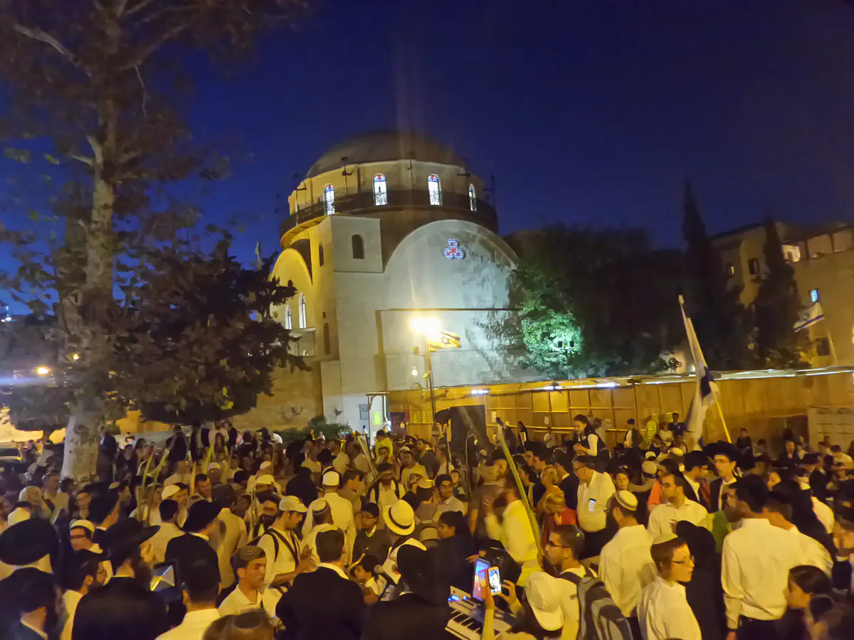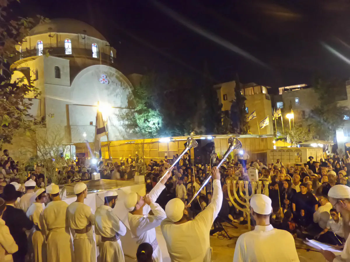 משם צעדו המשתתפים בשירים ובריקודים לרחבת בית כנסת החורבה יחד עם הרב ישראל אריאל, ראש מכון המקדש. ברחבת ''החורבה'' התקיים מעמד ניסוך המים בליווי מזבח מעץ, שולחן הפנים ומנורת המקדש.