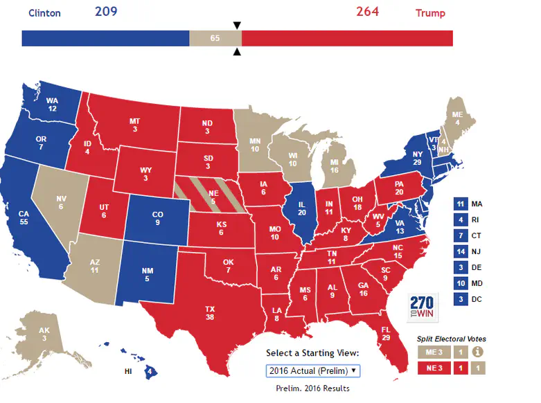 טראמפ ניצח עד כה ב-216 אלקטורים, לעומת 209 לקלינטון.