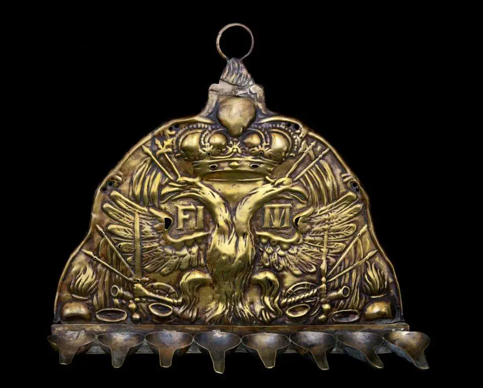 לוחית מתכת זו מעוטרת במרכזה בתיאור של נשר בעל שני ראשים, סמלה של שושלת בית הבסבורג, שהיה בשימוש עד 1835. לא ברור אם לוחית זו הייתה שייכת לחייל יהודי ששירת כקצין בצבא האוסטרי או נמצאה בשדה הקרב ונעשה בה שימוש משני כחנוכייה.