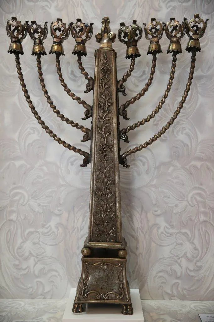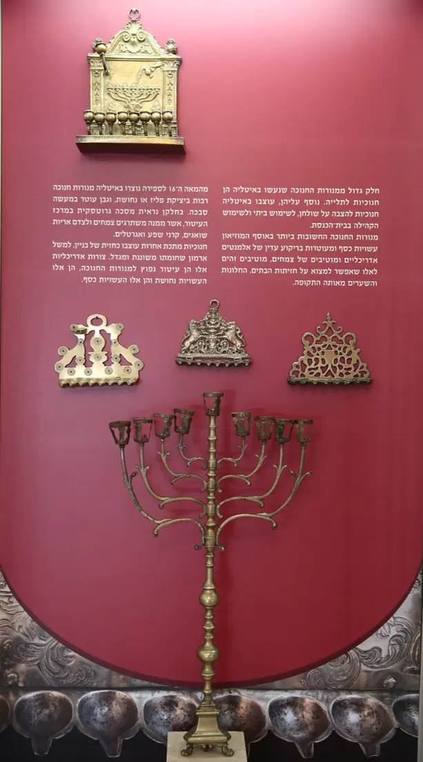 בתערוכה מוצגות חנוכיות שיצרו אמנים מאיטליה וחנוכיות שהיו ברשות אנשי הקהילה. חנוכייה יוצאת דופן באוסף היא חנוכייה עשויה לוחית מתכת שעיטרה כובע של חייל בצבא האוסטרי מהשנים 1740–1780.