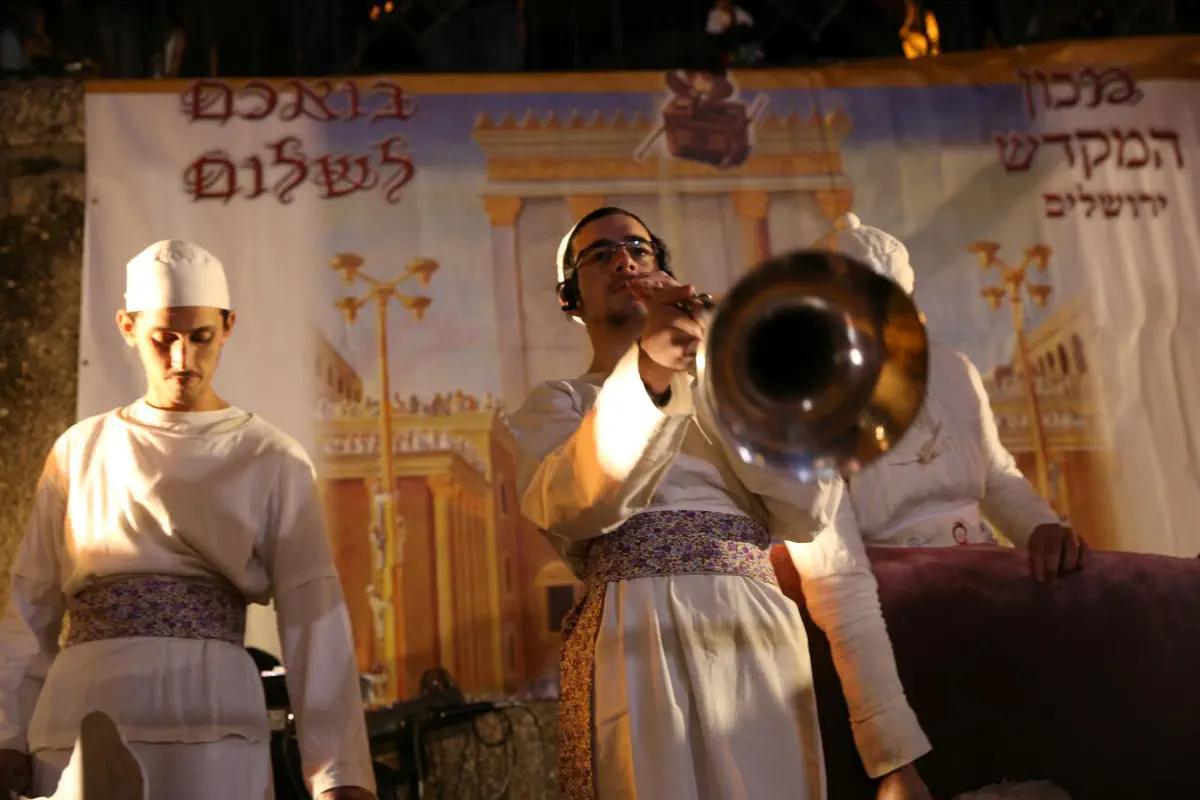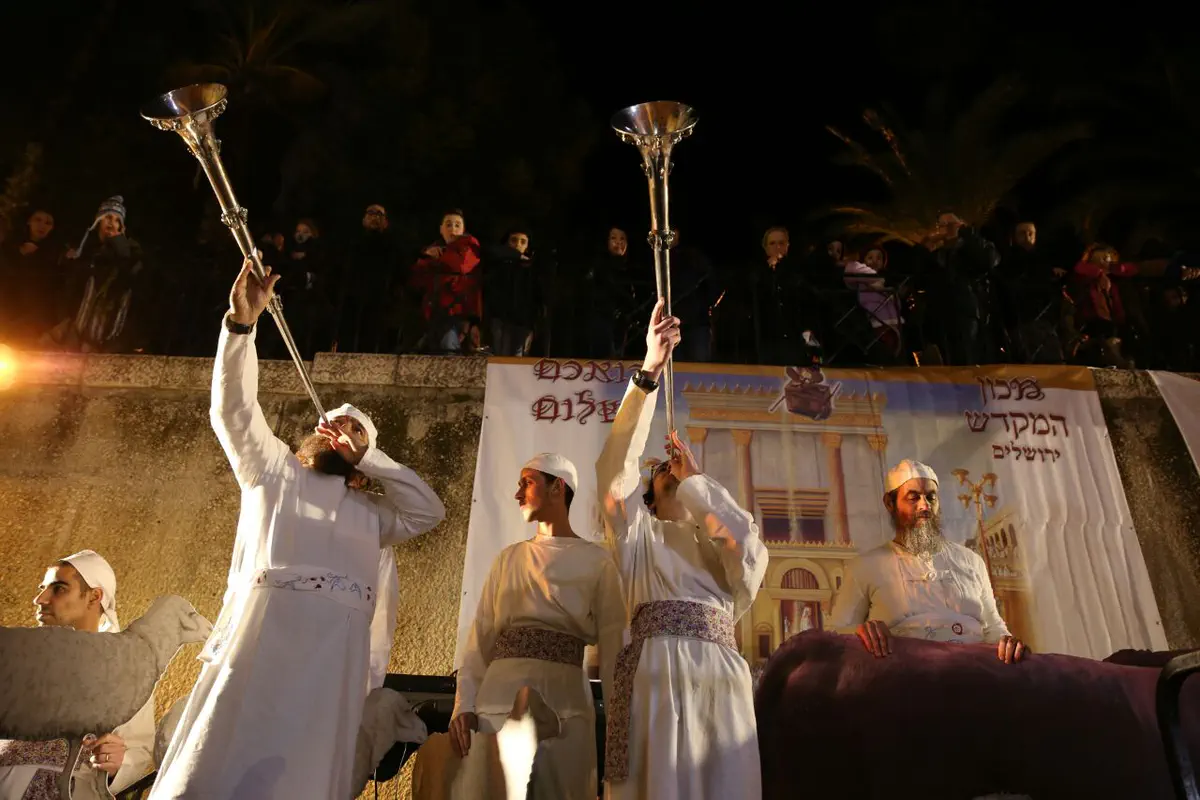 מדובר בתרגול של כהנים המשחזרים את חנוכת המזבח ומדליקים מנורת שבעה קנים כדוגמת מנורת המקדש.