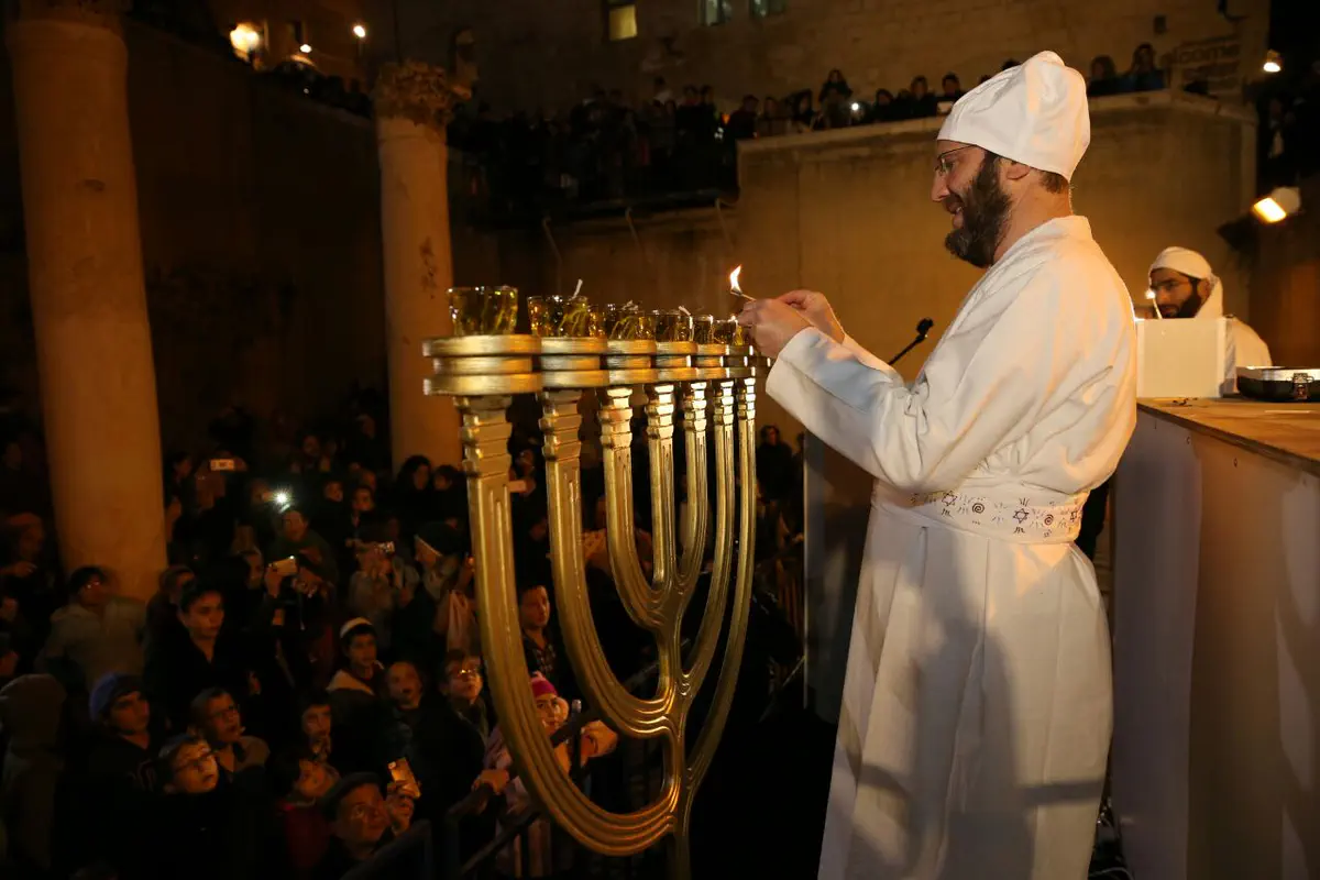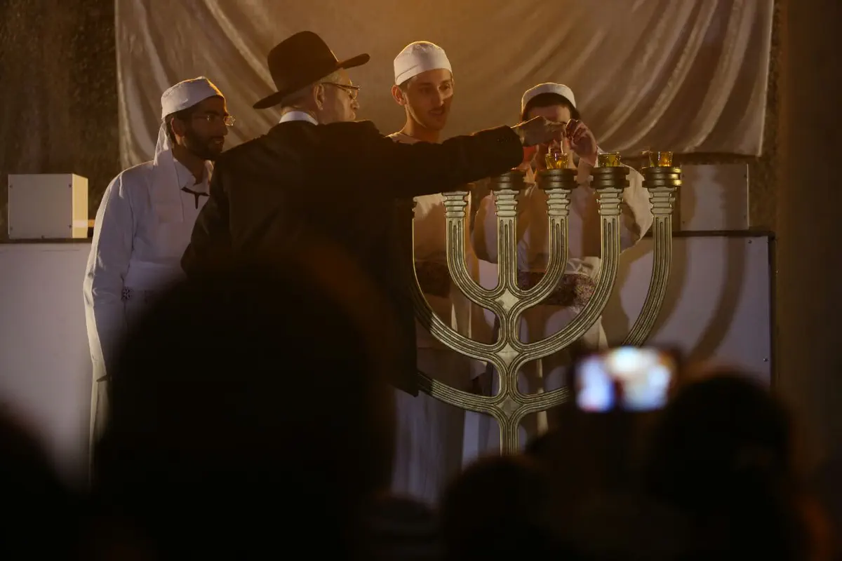שבעה כהנים לבושים בגדי כהונה לבנים תרגלו את הדלקת המנורה. כמו כן תרגלו את טקס חנוכת המזבח כפי שהיה בימי החשמונאים.