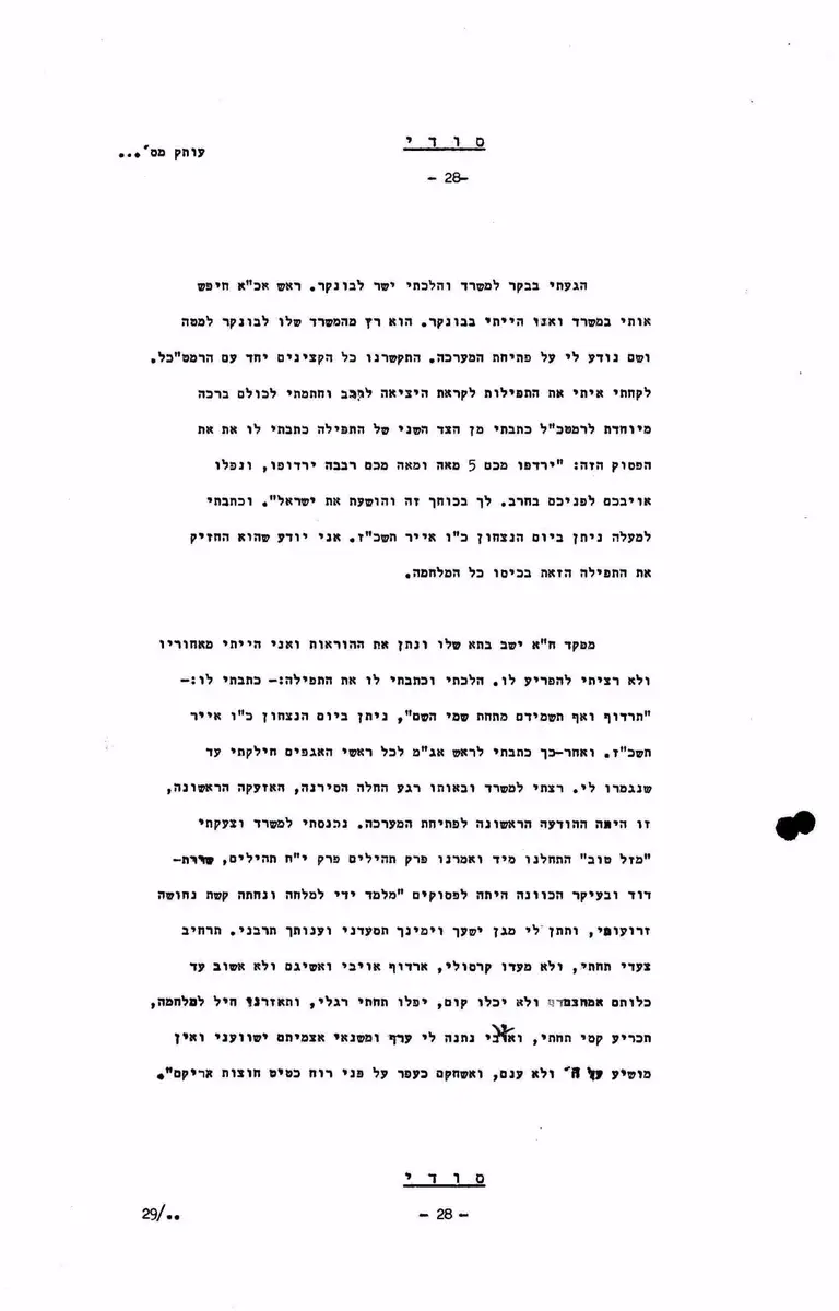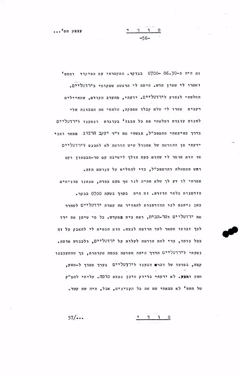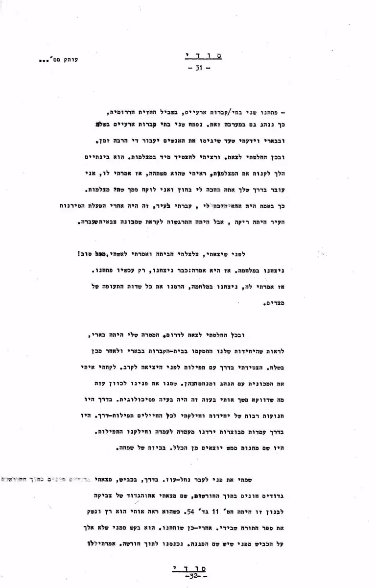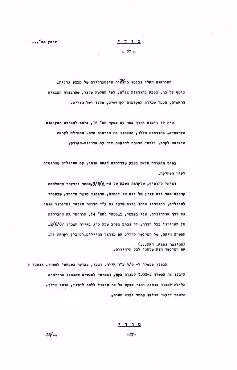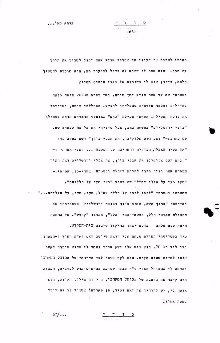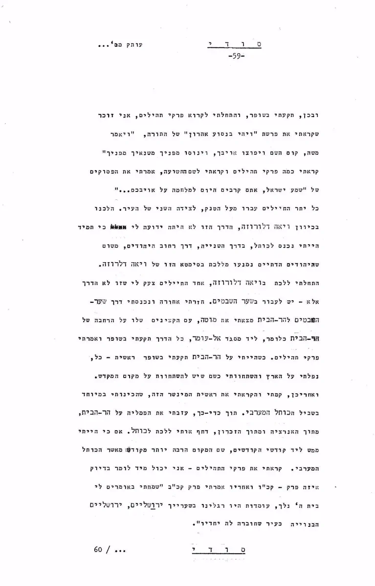 "ירדתי מן המכונית והחזקתי ביחד אחת את השופר וביד השנייה את ספר התורה. התחלתי לרוץ לכיוון שער האריות. לא ידעתי בדיוק איזה גדוד זה, זה היה גדוד 28. כלומר גדוד 71 הלך מאחוריו והתארגן ושרידי גדוד 28, הלכו לכיוון שער האריות. כל הדרך הייתה תחת צליפות והפגזה".