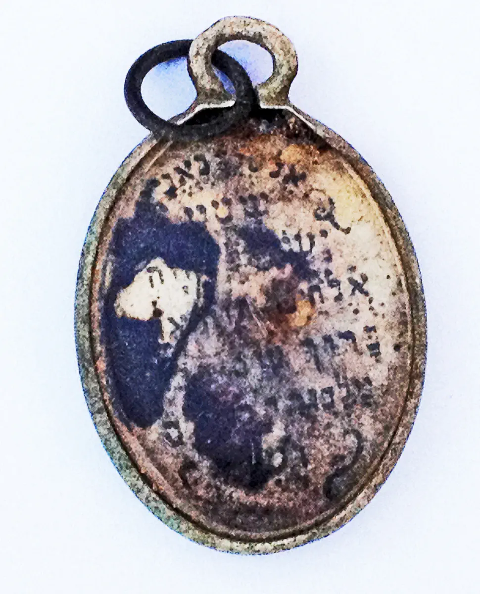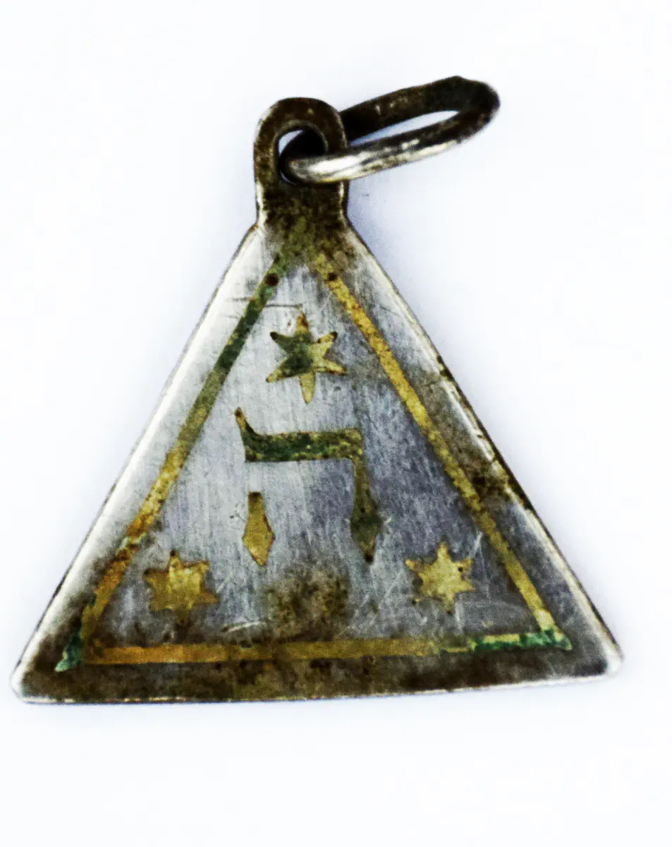 בין הממצאים - תליון מתכת מצופה זכוכית שעליו דמותו של משה רבנו האוחז בלוחות הברית ועל צדו השני תפילת 'שמע', תליון בצורת מגן דויד ושעון נשים. תליון נוסף שנחשף, בצורת משולש, העסיק את החוקרים במיוחד משום שהוא נשא פרטים מזהים: על צדו האחד נכתב 'מזל טוב' בעברית, התאריך 3.7.1929 ושם העיר 'פרנקפורט על המיין' בגרמנית, ובצדו השני - האות 'ה' ושלושה מגני דויד.