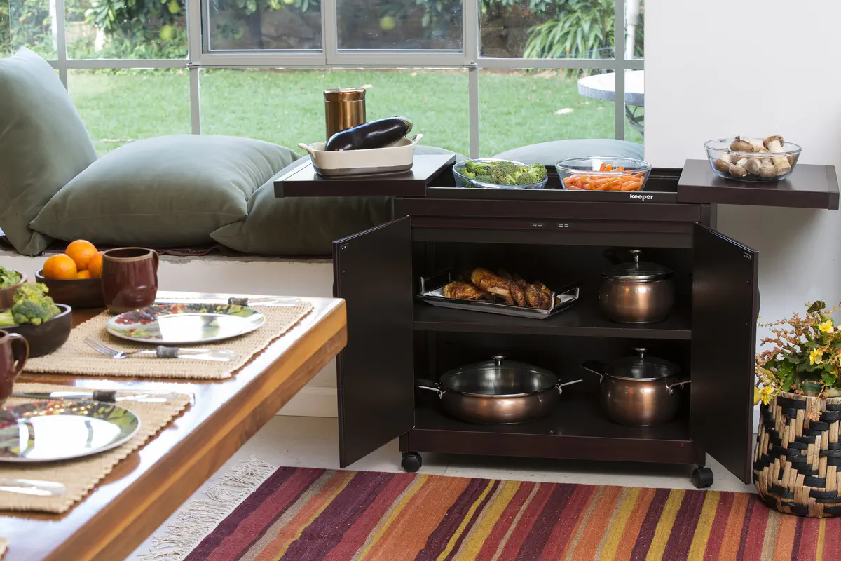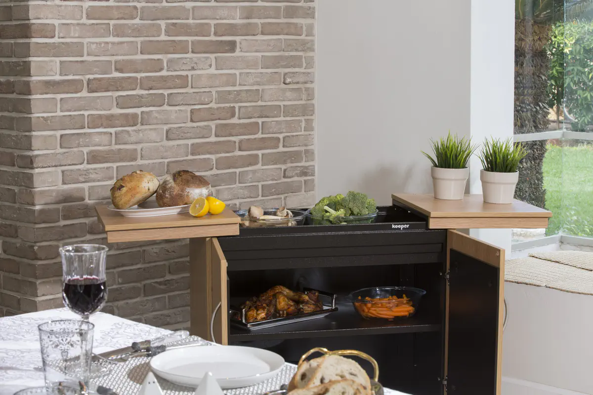 keeper מצויד בארבעה גלגלים ומתנייד בקלות מהמטבח אל חדר האוכל או לחצר ומצויין לאירוח חוץ ולשומרי שבת, כך שתוכלו לארח בנוחות ובחום, גם מספר רב של אורחים. הארון מגיע בשלושה סוגי גימור: מתכת, למינציה, ועץ פורניר ובמגוון צבעים לבחירתכם.