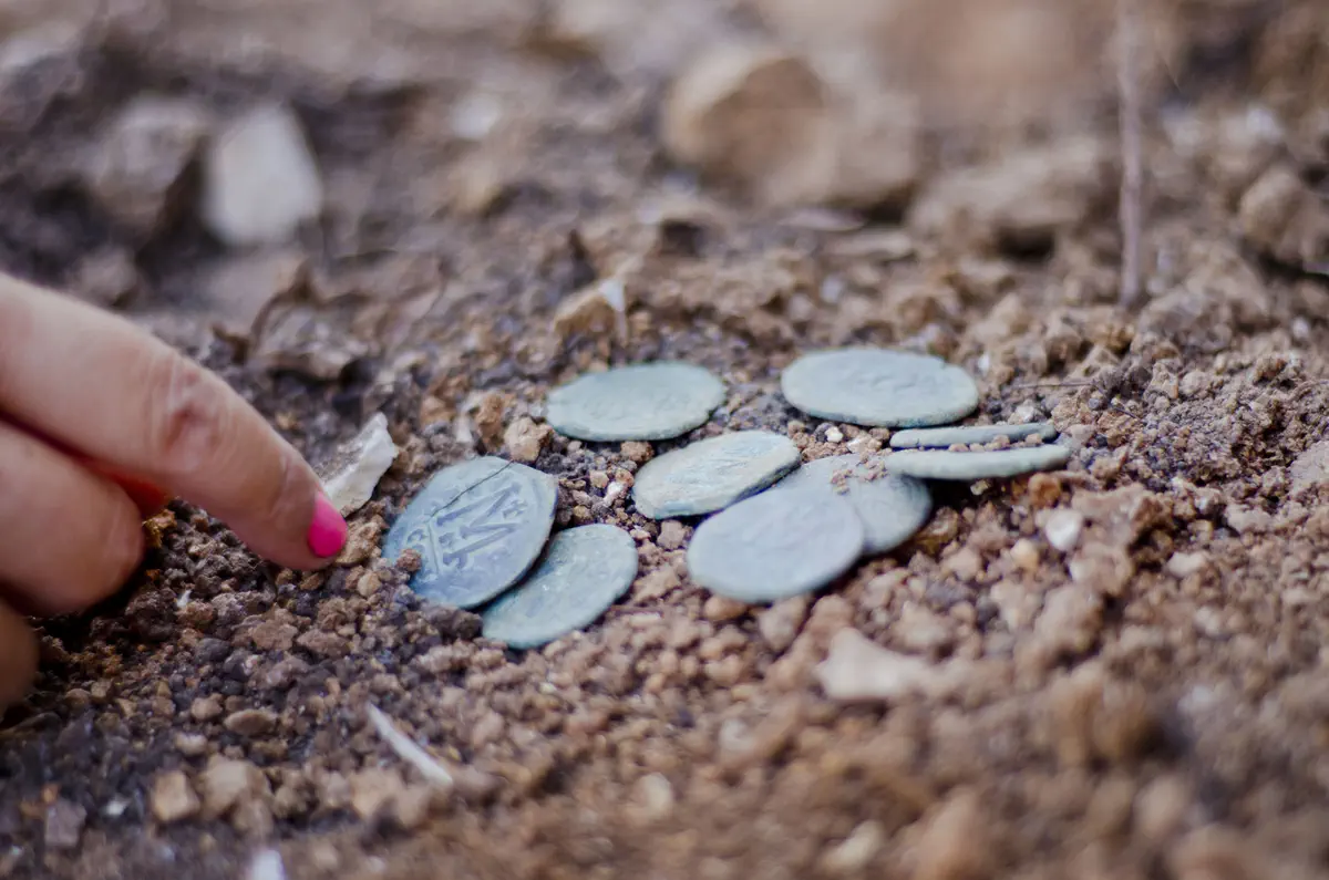 בחפירות, שנערכו בחודש יוני האחרון, נחשף מבנה גדול בן שתי קומות, ולצידו גת מורכבת לייצור יין. לדברי אנט לנדס-נגר, מנהלת החפירה מטעם רשות העתיקות, "המטמון נמצא בצמוד למבנה, בתוך מפולת של אבנים גדולות. נראה כי בעל המטמון צרר אותו בארנק בד בתוך נישה מוסתרת בקיר בעת סכנה, בתקווה לשוב ולאסוף אותו, אך היום אנו יודעים שזה לא עלה בידו".