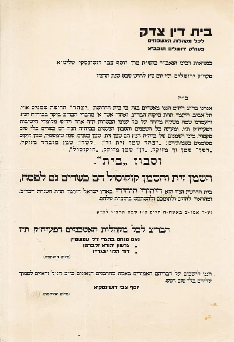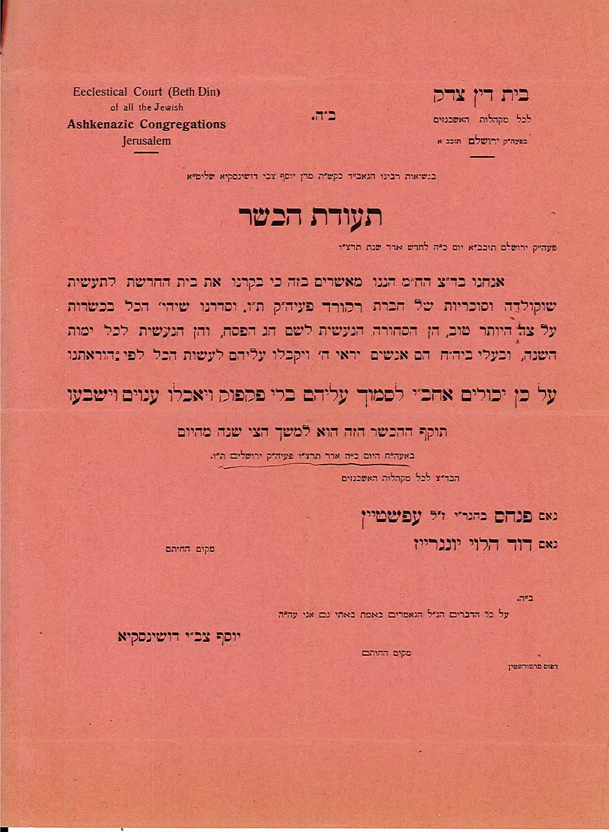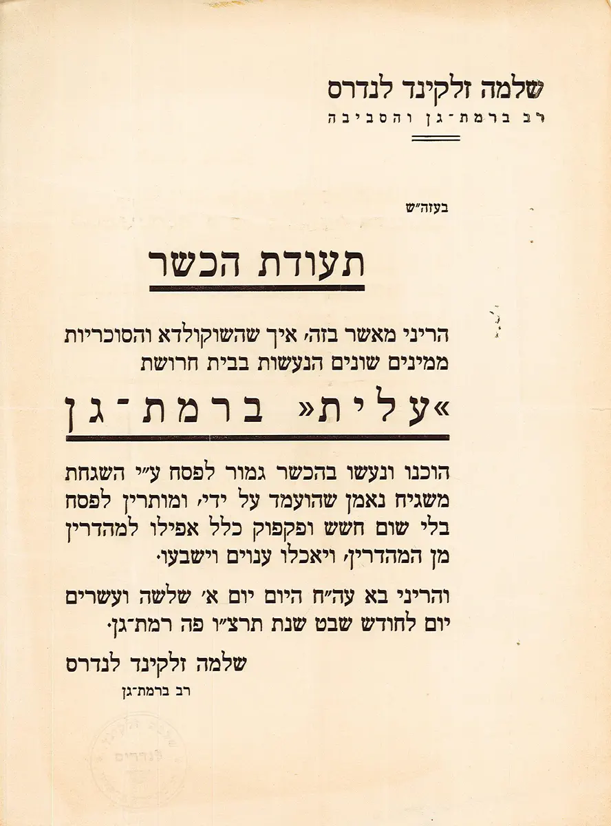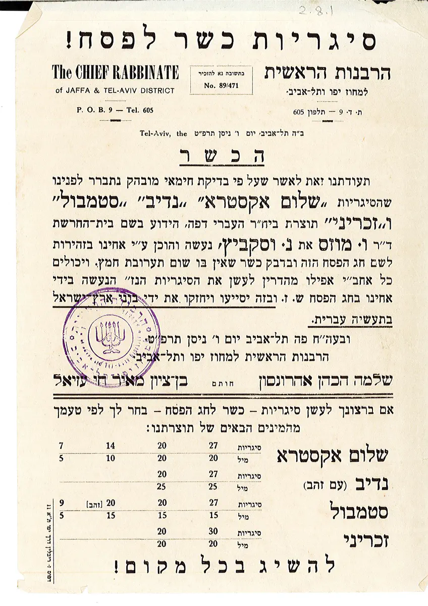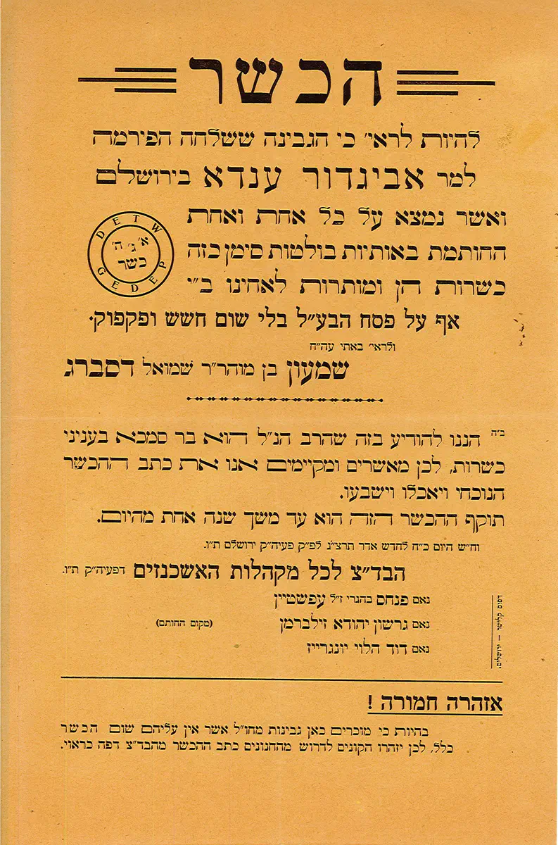 בין התעודות שנמצאו: תעודת כשרות לפסח לבית החרושת "עלית" בהשגחת רב רמת גן שלמה זלקינד לנדרס, תרצ"ו – 1936. תעודת כשרות לפסח לבית החרושת לשמנים "יצהר" בתל אביב בהשגחת הבד"ץ, תרצ"ו – 1936. תעודת כשרות לבית החרושת לשוקולדה וסוכריות של חברת "רקורד" בירושלים בהשגחת הבד"ץ, תרצ"ו – 1936. תעודת כשרות לפסח של יין ראשון לציון בחותמת של הרב נפתלי הרץ הלוי, תרנ" – שנות התשעים של המאה ה-19. תעודת כשרות לפסח לגבינה של היבואן אביגדור ענדא בירושלים בהשגחת הרב שמעון דסברג ובהשגחת הבד"ץ, תרצ"ג – 1936.