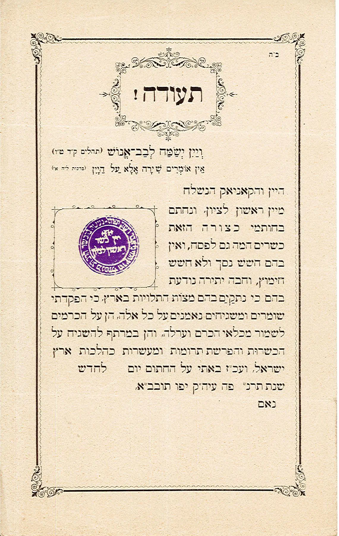 תעודות כשרות מיוחדות לפסח נמצאו בארכיון האישי של ד"ר משה וולך, אשר ייסד את בית החולים "שערי צדק" בירושלים בשנת 1901.