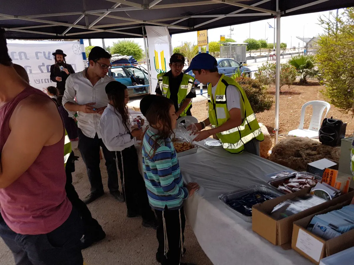 השוטר עוצר כל מכונית שמגיעה ממירון ומנחה את היושבים ברכב לצאת להתרענן. בתחנה מחכים מתנדבים ושוטרים ומחלקים למתרעננים קפה, קרטיבים כיבוד והסברה, במאור פנים ובשמחה.