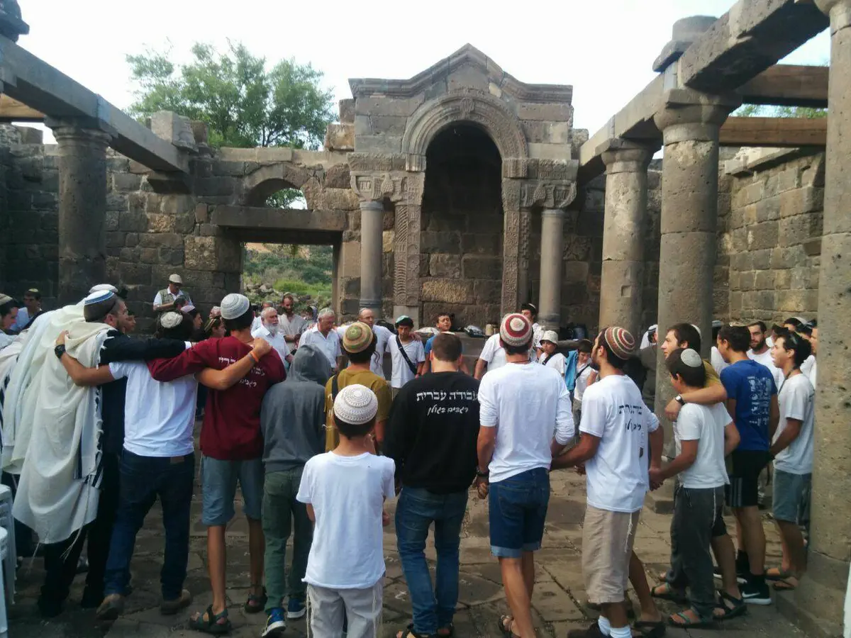 עשרות אנשים התכנסו הבוקר (רביעי) לתפילת שחרית של יום ירושלים, בבית הכנסת העתיק "קשתות רחבעם" באום אל קנטיר שברמת הגולן.