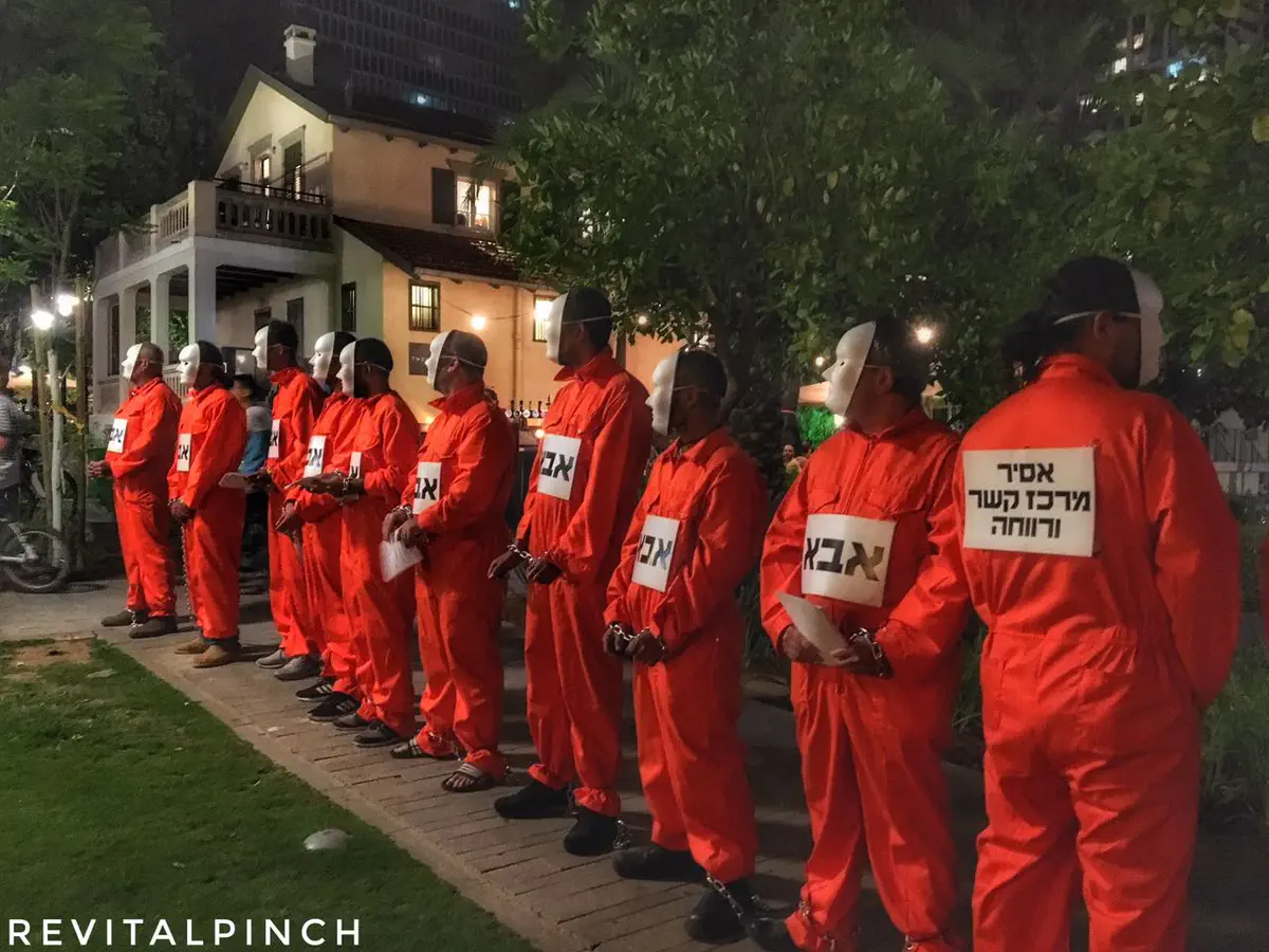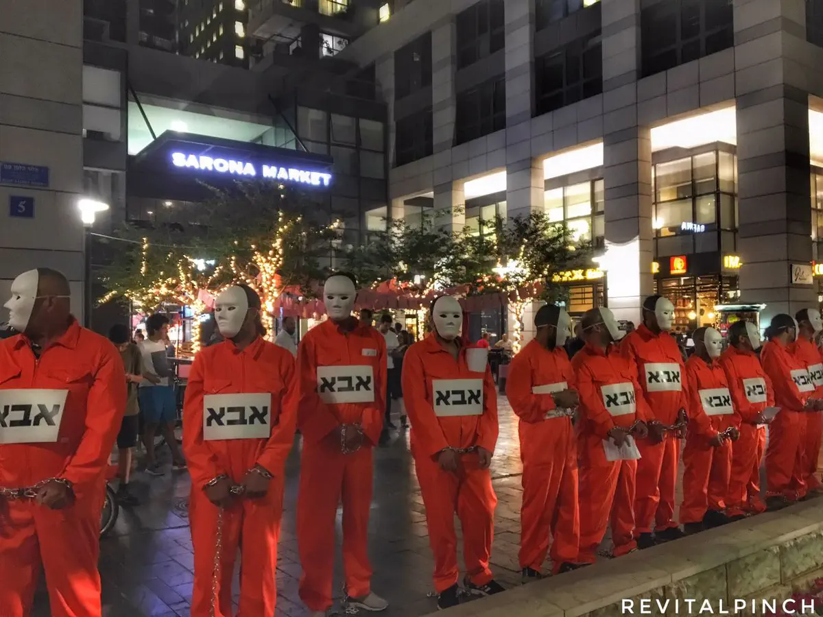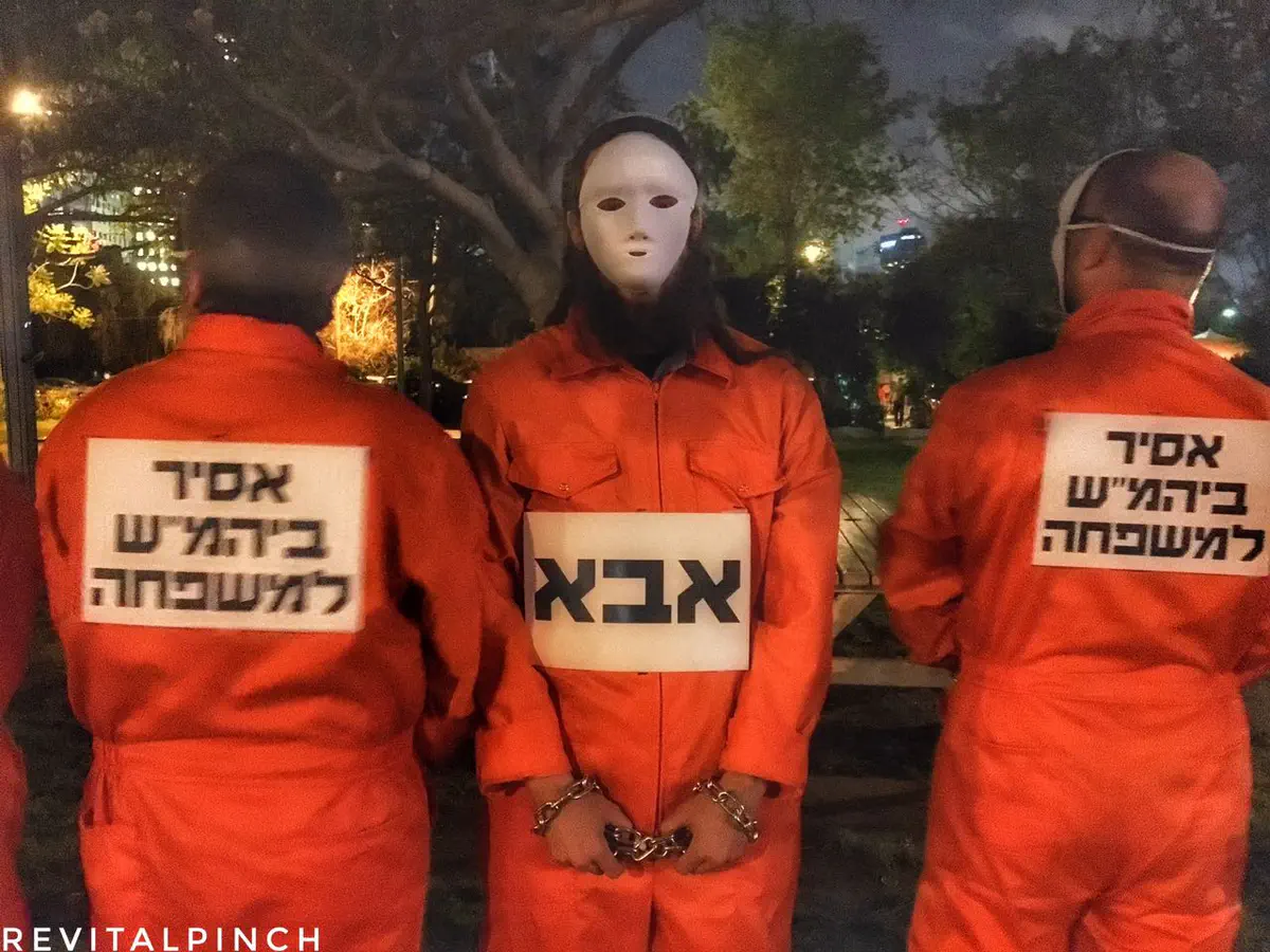 על החזה נשאו שלט ובו הכיתוב: "אבא". על גבם נכתב: "אסיר בית המשפט למשפחה", "אסיר ההוצאה לפועל", "אסיר הרווחה ומרכזי הקשר".