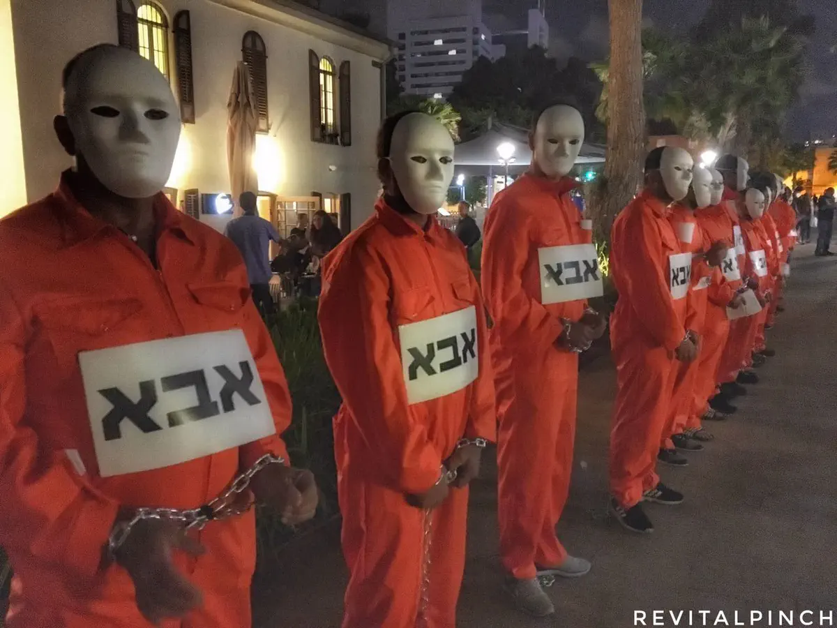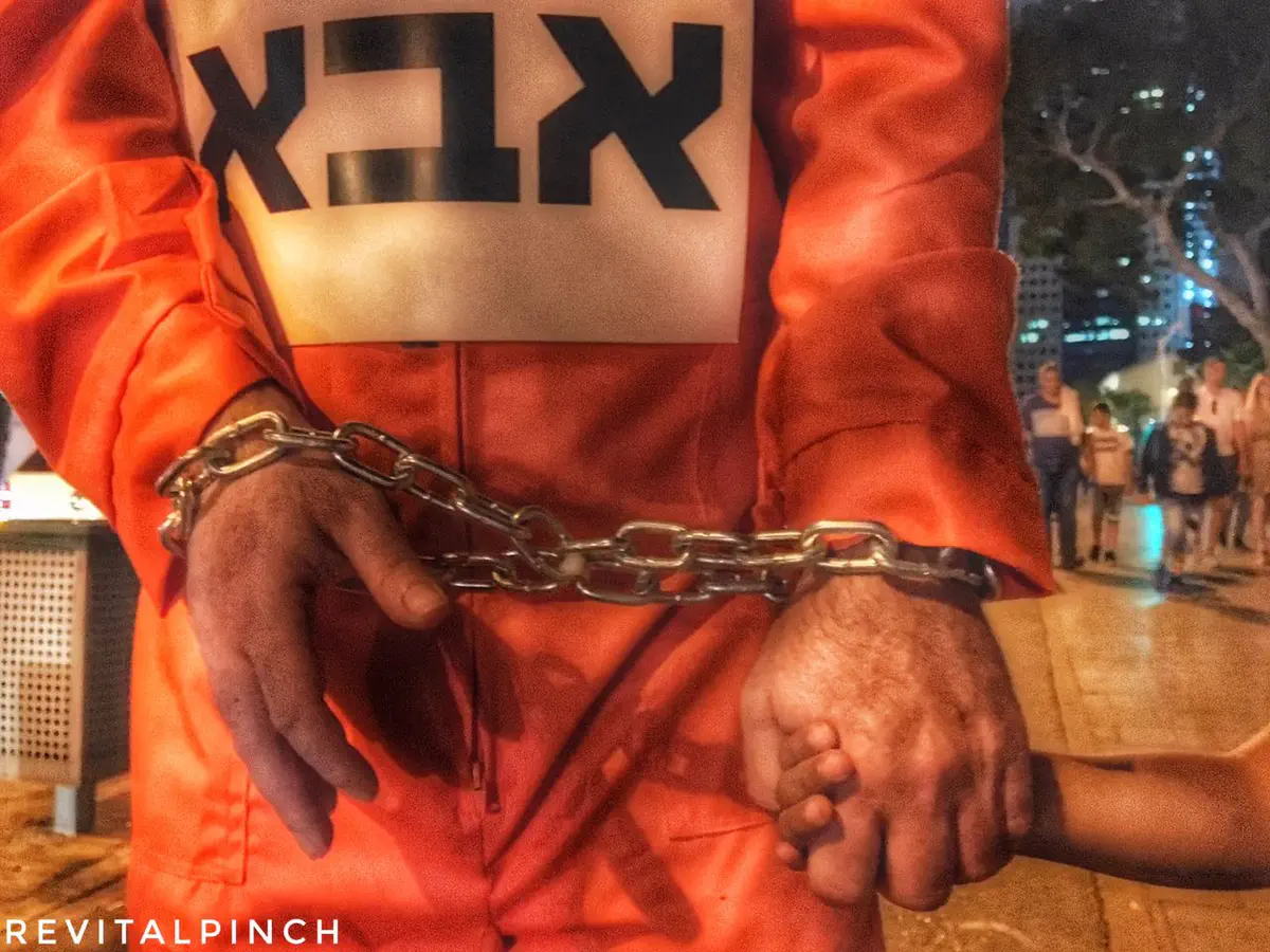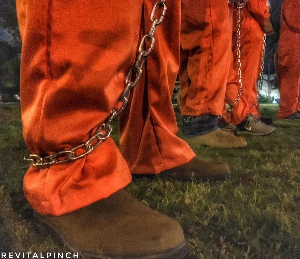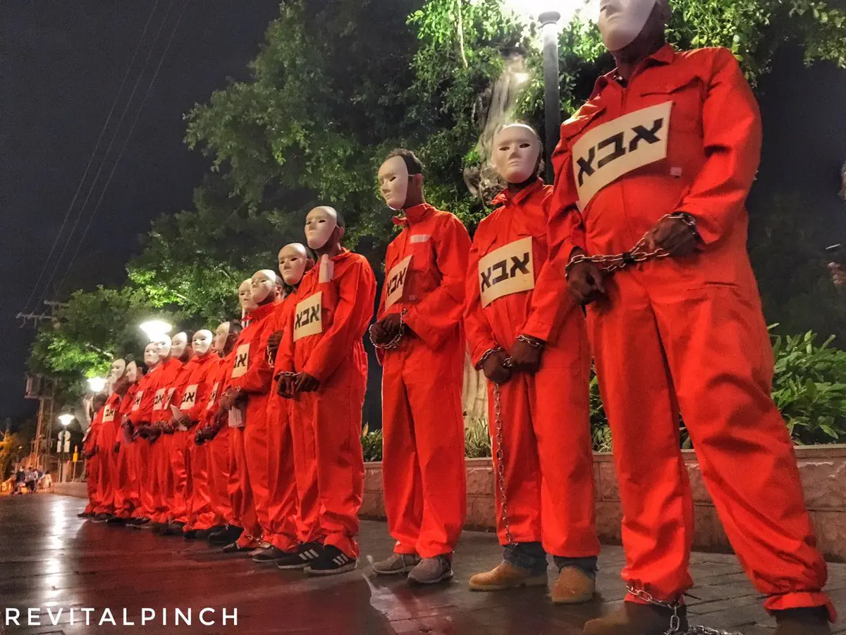 הם צעדו במתחם שרונה אזיקי רגליים, לבושים בסרבלי אסירים כתומים, עם מסיכות על פניהם.