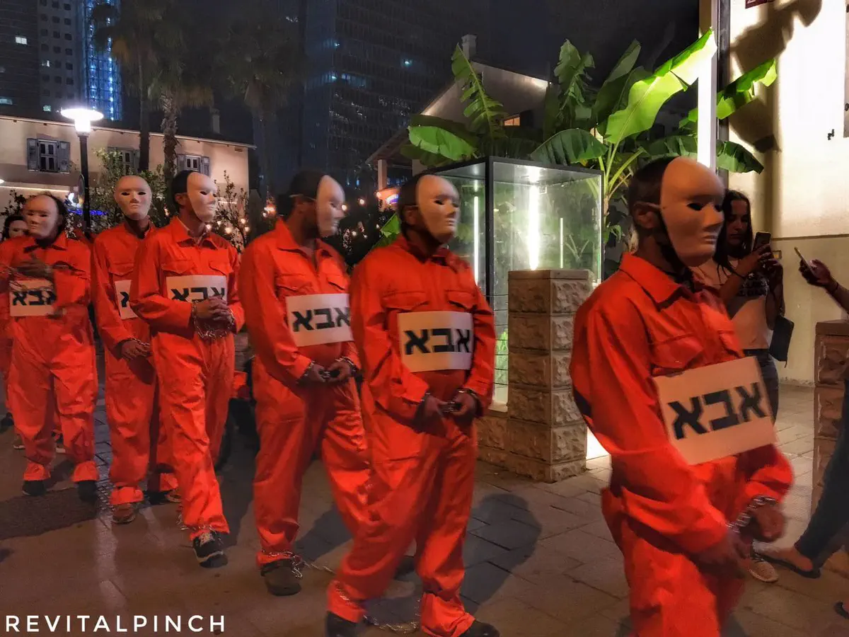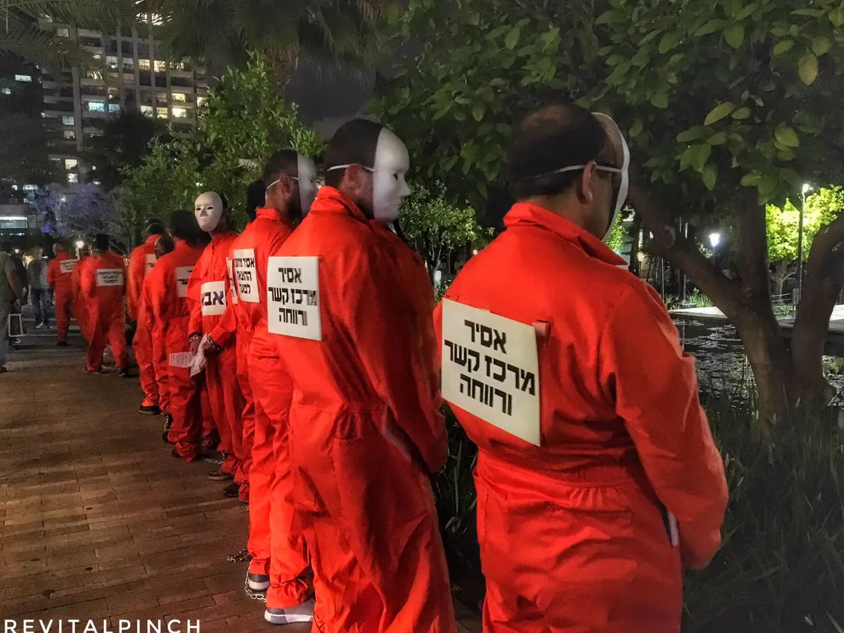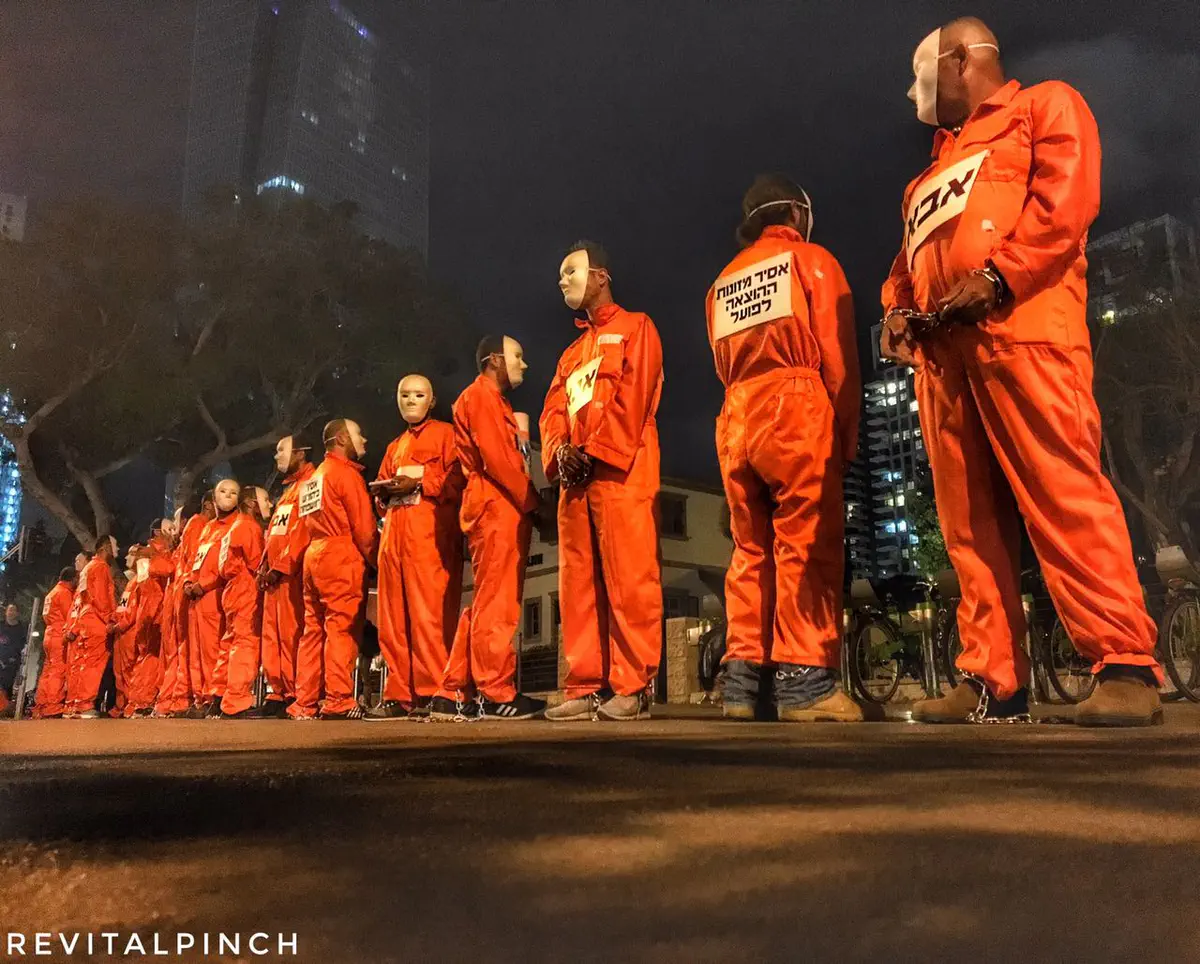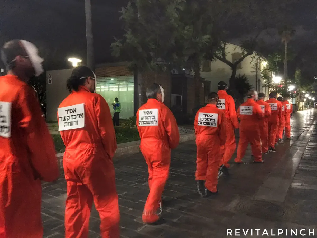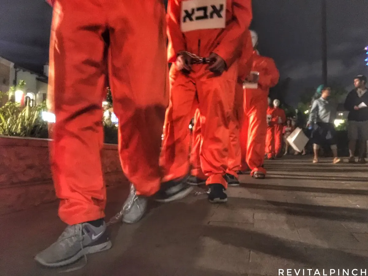 הם צעדו במתחם שרונה אזיקי רגליים, לבושים בסרבלי אסירים כתומים, עם מסיכות על פניהם.