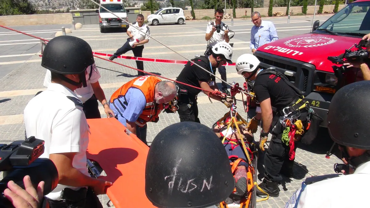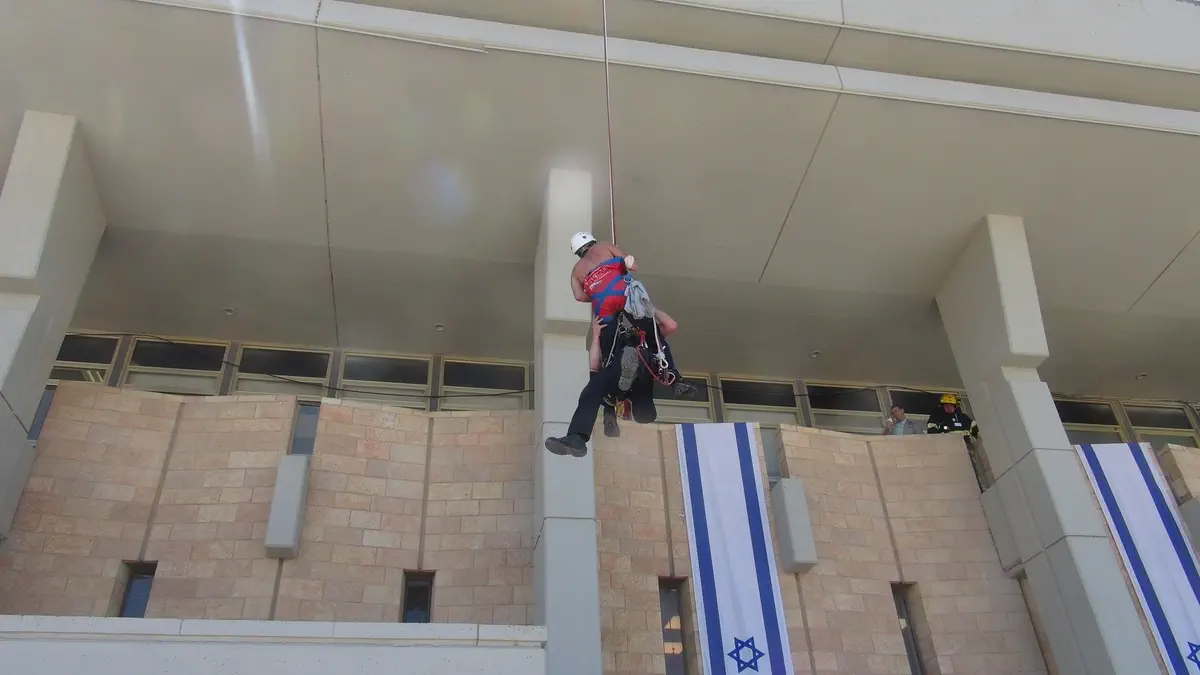 כמו כן, תורגל תרחיש של חילוץ לכודים מגובה לרחבת הכנסת באמצעות אומגות, חבלים וסולמות, טיפול בפצועים ובנפגעים ולראשונה תורגל פינוי מוסק של נפגעים על-ידי מסוק מד"א שינחת לראשונה במנחת ''גן הוורדים'' סמוך לכנסת.