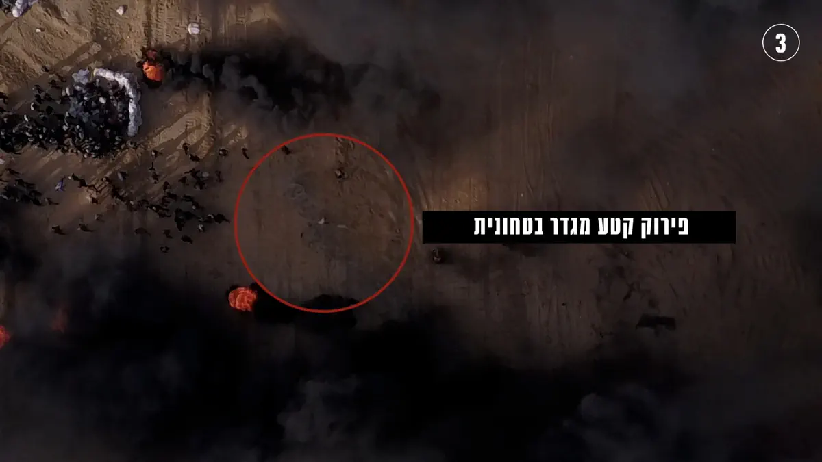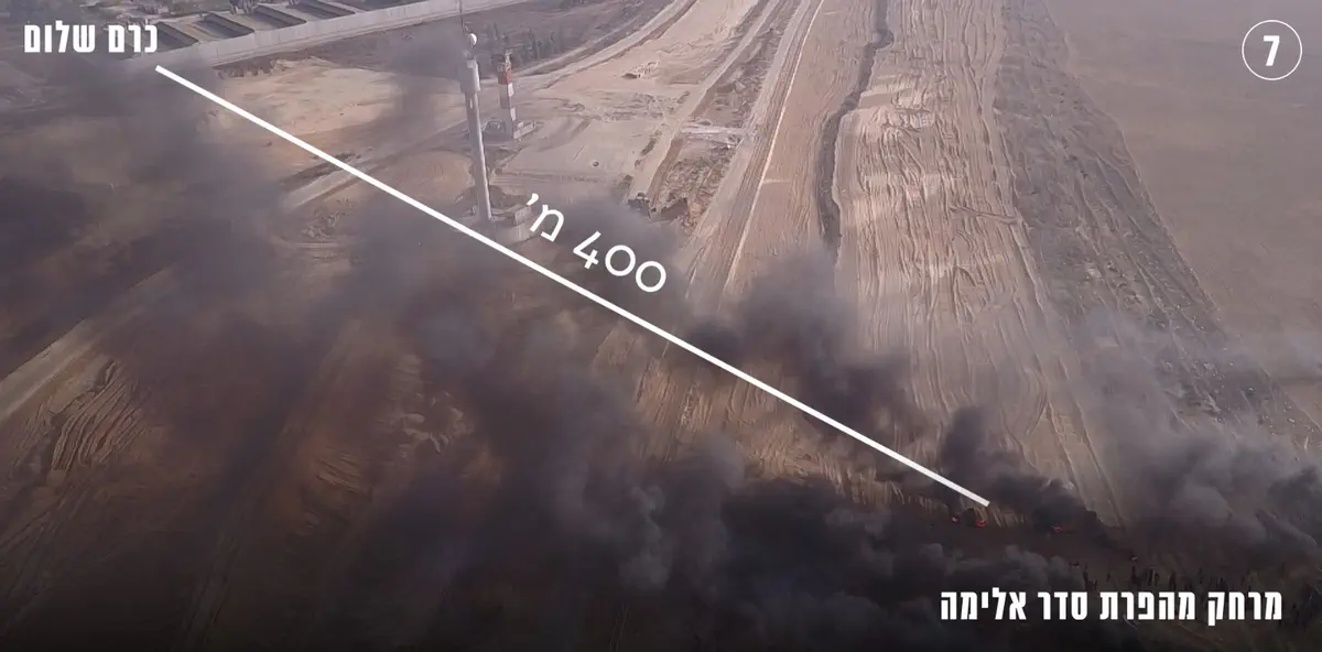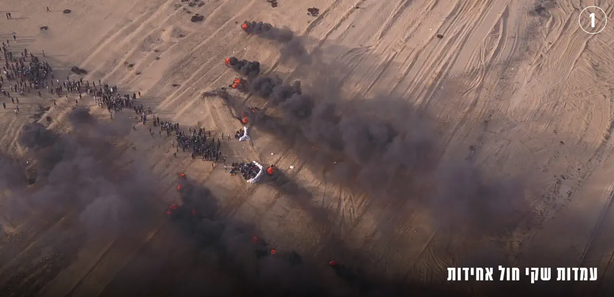 בין היתר נראים המפגינים ממקמים שקי חול מול גדר המערכת ומבעירים צמיגים על מנת לייצר מיסוך עשן. במקביל, המתפרעים מפריחים ''עפיפוני תבערה'' וחלקם זוחלים לגדר בחסות העשן ומנסים לחצות אותה, ואז ההמון מתחיל להתקדם לעבר שטח ישראל.
