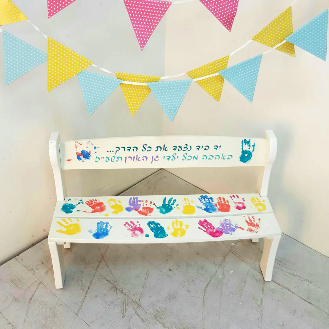 ״ספסל כפות ידיים זו מתנה נהדרת, שמשלבת פעילות כיפית לילדים. הספסל נקי מחריטות ומציורים. לוקחים צבעים, על בסיס מים, שנמצאים בכל חנות יצירה. משתמשים ברולר ומורחים אתידי הילדים כדי שיטביעו את חותמם על הספסל. הפעילות מהממת והתוצאה עוד יותר״.