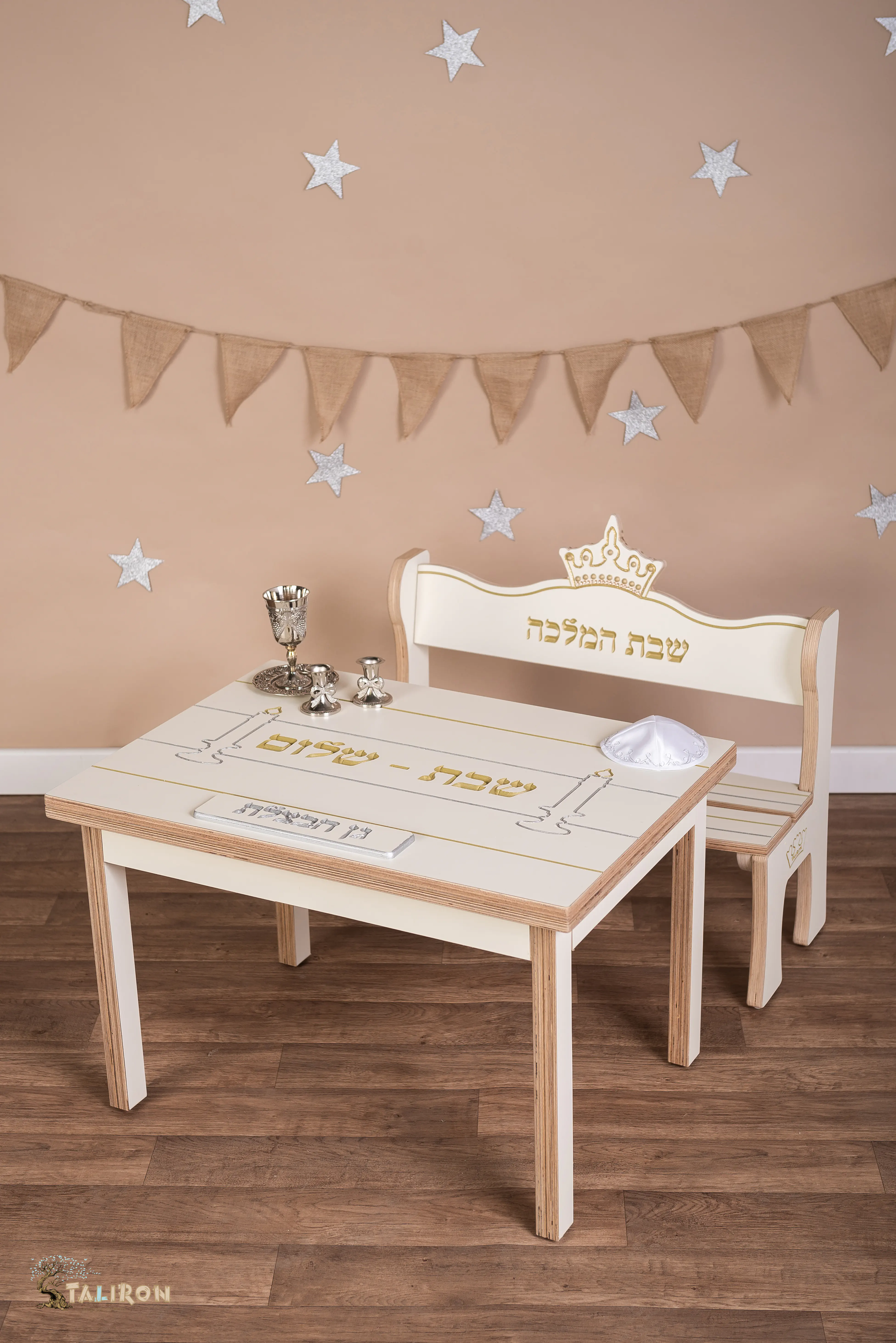 ״עיצבנו שולחן וכיסאות עם חריטות מיוחדות, אישיות. תכננו הבלטות, מושקעות שישתלבו בכל גן. התגובות מעידות שקלענו למטרה. זו מתנה מרגשת, עם ערך! ומאוד שימושית. הילדים מחכים לתורם בקבלת השבת.״