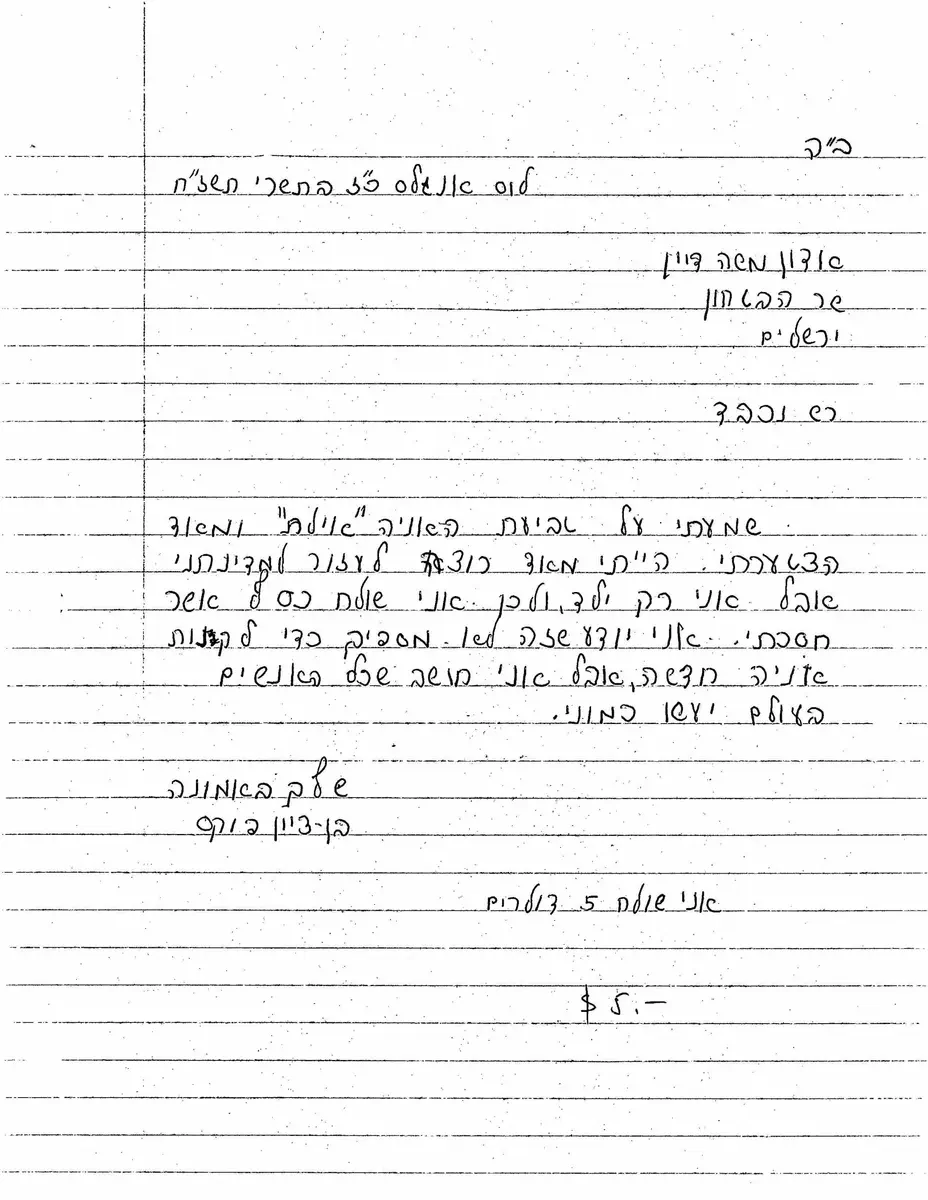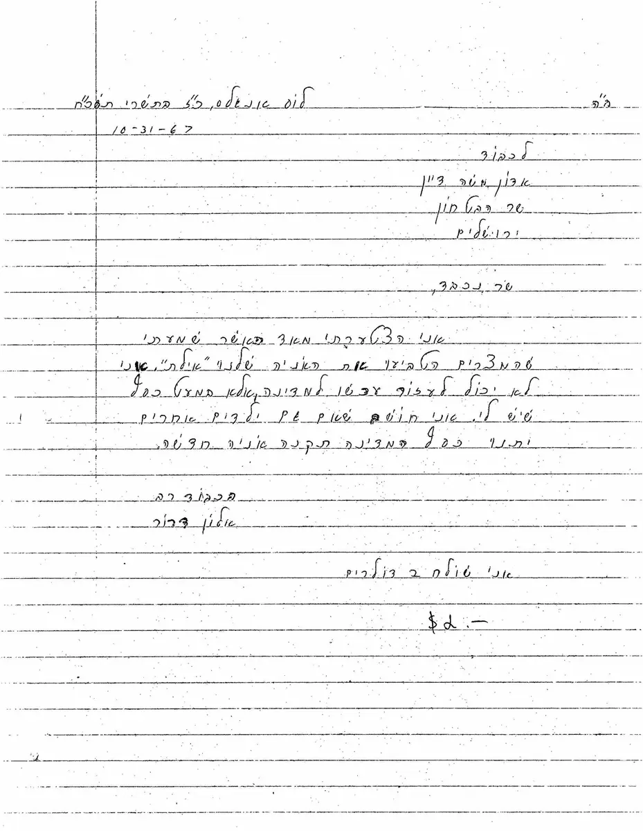 התלמידים צירפו למכתבים כסף כדי שמדינת ישראל תוכל לקנות משחתת חדשה במקום אח"י אילת שטבעה. בתחתית כל מכתב כתבו התלמידים כמה כסף הם שולחים.